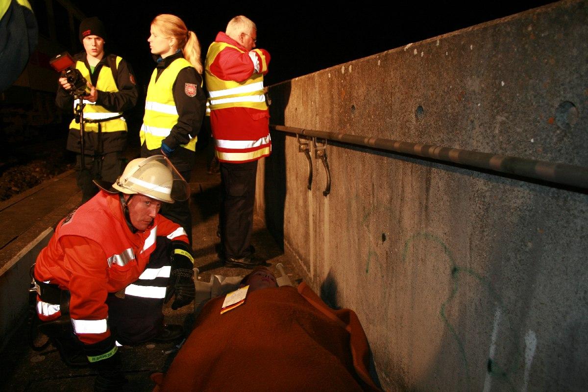 Der Sanitätsdienst baute ein Sichtungsplatz für die Verletzten auf. Parallel dazu wurde die Rettung aus den Zugabteilen eingeleitet. Da sich der gesamte Bereich der Strecke auf einer Brücke befindet, war der Transport in die Tiefe eine schwierige Herausforderung. Hierzu wurde eine Kufenbahn mittels Steckleiterteilen und Schleifkorbtragen errichtet. Im späteren Verlauf konnte das THW stufenartige Plattformen am Hang errichten, die die Rettungsmaßnahmen erleichterten. Die gehfähigen Personen wurden über Stufenaufgang hinuntergeführt und an der Verletztensammelstelle betreut.