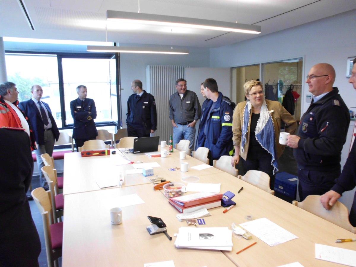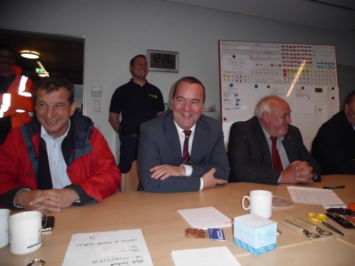 Um 12:30 Uhr traf sich der Sarstedter Krisenstab zur einem abschließenden Lagebericht. Hierzu hatte sich hoher Besuch angekündigt. Der Innenminister Boris Pistorius, zusammen mit dem Landtagsabgeordneten Markus Brinkmann kamen, um sich über das Ausmaß und den Verlauf der Maßnahmen zu informieren. Hierzu konnte Bürgermeister Karl-Heinz Wondratscheck ebenfalls Landrat Reiner Wegner und Helfried Basse von der Kreisverwaltung begrüßen.