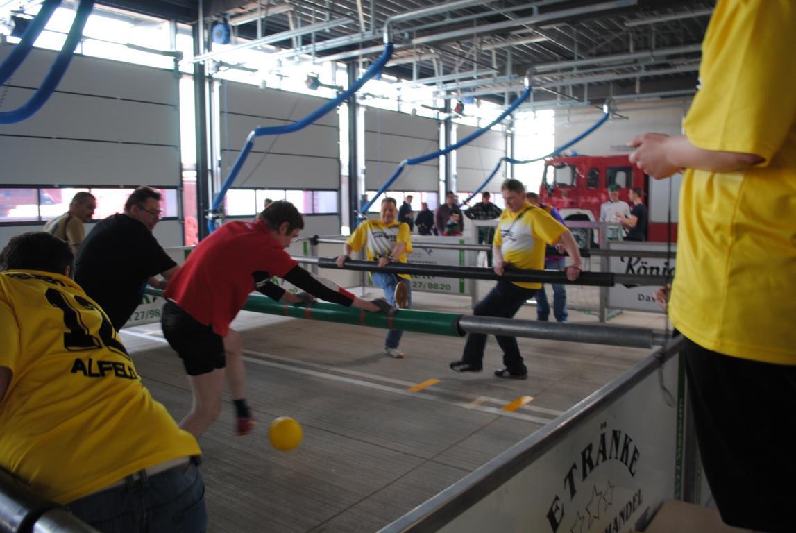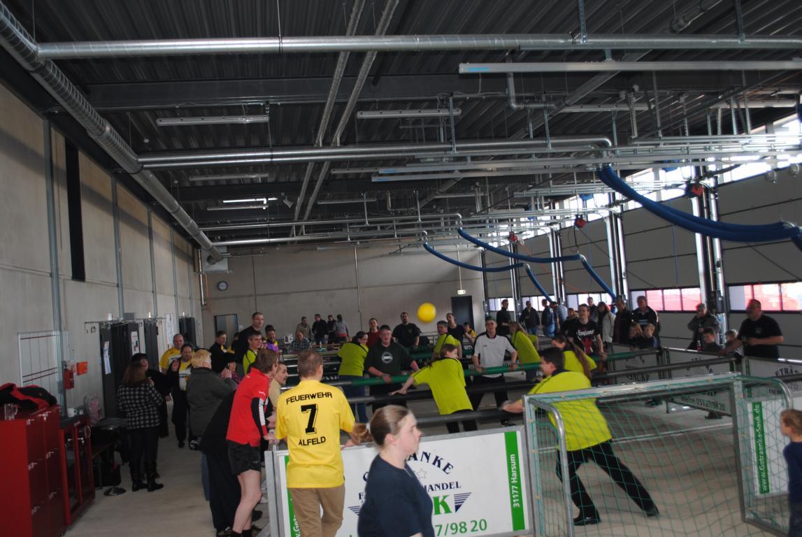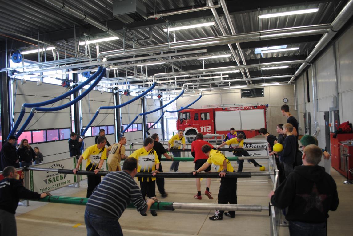 Aufgrund des Umzuges in das neue Feuerwehrhaus fand sich leider letztes Jahr kein Termin mehr und so wurde dieses Spiel jetzt kurzerhand nachgeholt. Ein wenig ungewöhnlich war diesmal jedoch das Spielfeld – eine Art Krökeltisch mit “echten Spielern”. Die Beteiligung war auf beiden Seiten so groß das jeweils drei Mannschaften ins Rennen gingen um um den begehrten Pokal zu spielen. Am Ende sicherte sich die Mannschaft Sarstedt 2 den Sieg im Finalspiel.