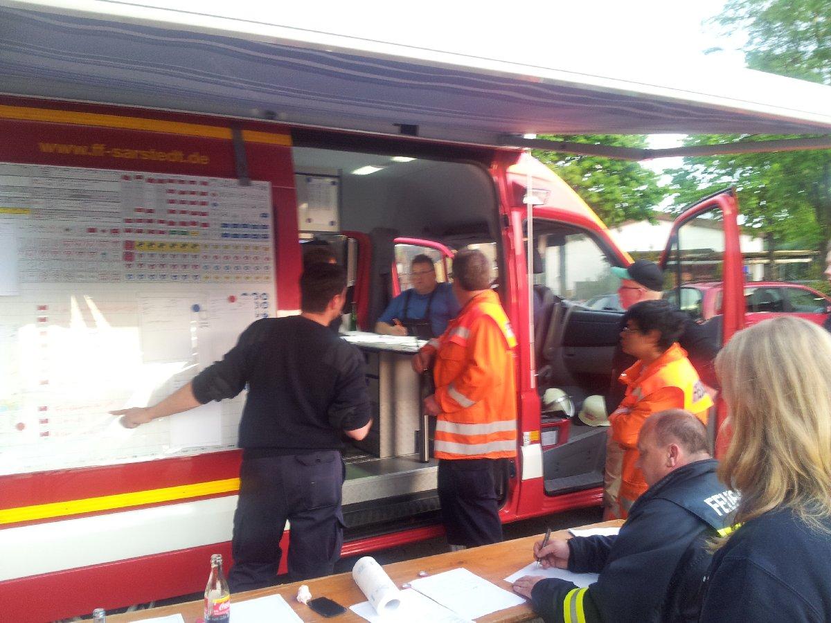 Am Abend sind innerhalb von einer Viertelstunde im Stadtgebiet Sarstedt 18 Liter Wasser pro qm niedergegangen. Bereits um 18:46 Uhr sind in der Leitstelle über 20 Anrufe eingegangen, mit überfluteten Kellern und Straßen und umgeknickten Bäumen. Sofort wurde im Feuerwehrhaus Sarstedt am Einsatzleitfahrzeug eine örtliche Einsatzleitung eingerichtet. Diese lies alle Ortsfeuerwehren des Stadtgebietes alarmieren, um die einzelnen Einsatzstellen abzuarbeiten.