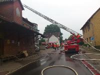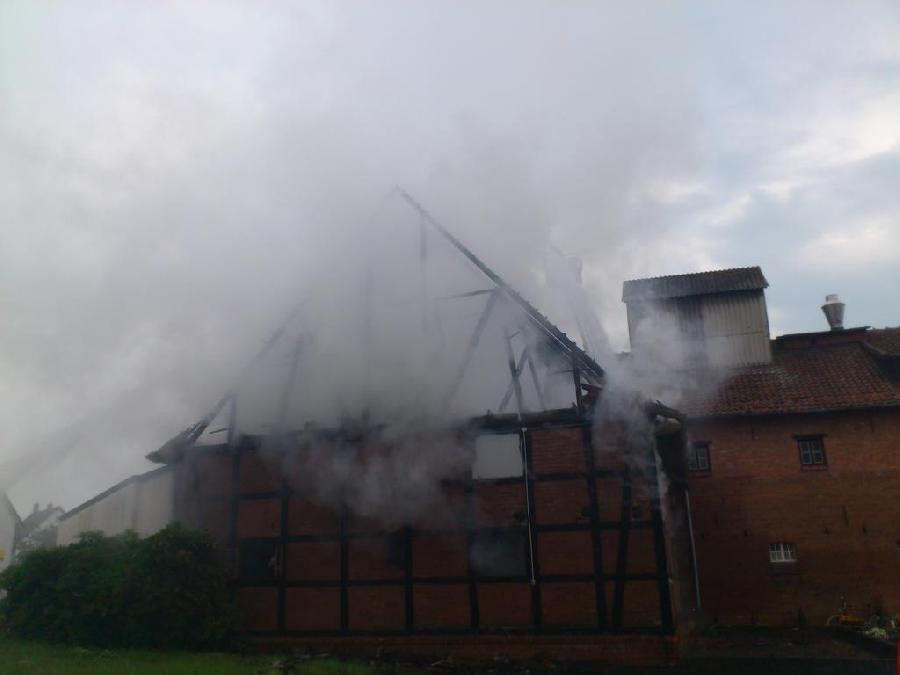Es war kurz vor 07:00 Uhr des heutigen Morgens ( Mi., 8.6.2011) , als der Inhaber des Landhandels damit beschäftigt war, Waren aus Lagern in seine Verkaufsräume zu transportieren. Hierbei wurde er darauf aufmerksam, dass aus dem Dachbereich einer auf dem Gelände stehenden rückwärtigen Lagerscheune, in der Stroh, Heu, Saatgut und auch landwirtschaftliche Maschinen stehen, Rauchschwaden in den Himmel zogen. Nachdem der Firmeninhaber die Scheune erreicht und ein Tor geöffnet hatte, erkannte er Flammen, die er versuchte mit eigenen Mitteln zu löschen. Das Feuer breitete sich jedoch rasch aus, so dass der Mann die Scheune eilig verlassen musste. Durch die Hitzeentwicklung erlitt er leichte Verbrennungen ( Rötungen ) im Gesicht. Die alarmierte Feuerwehr unter Leitung von Gemeindebrandmeister Markus Peisker rückte mit 6 Ortswehren an. Das in großen Teilen auf holzbauweise bestehende Gebäude war aber nicht mehr zu retten und scheint abrissreif. Der Dachstuhl brannte völlig aus. Brandermittler des Hildesheimer Zentralen Kriminaldienstes haben die Ermittlungen aufgenommen.