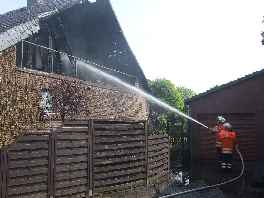 Zwei Stunden lang hatten am Freitag mehr als 80 Feuerwehrleute gegen den Brand gekämpft, bis sie das Feuer im Dachstuhl unter Kontrolle hatten. Immer wieder flackerten die Flammen neu auf. Am Ende war der gesamte Dachstuhl vernichtet, und das Haus selbst ist schwer beschädigt. Allein der Wasserschaden ist immens. Der Schaden liegt bei 250 000 Euro, schätzen Polizei und Feuerwehr. Ein zufällig vorbeikommender Feuerwehrmann hatte, wie berichtet, den Hauseigentümer in Sicherheit gebracht.