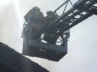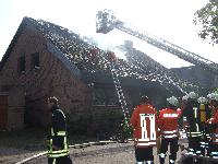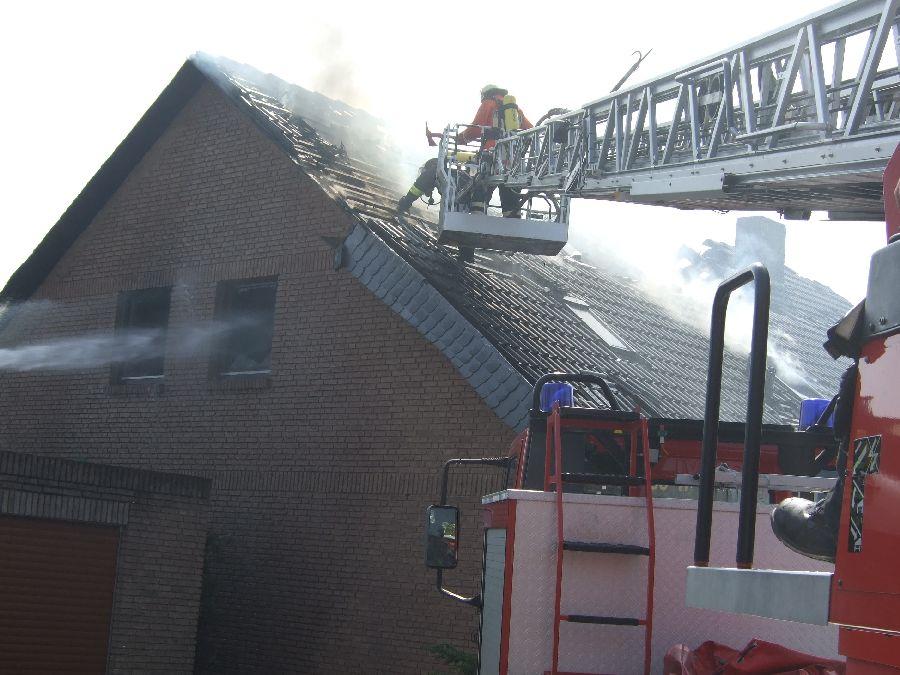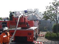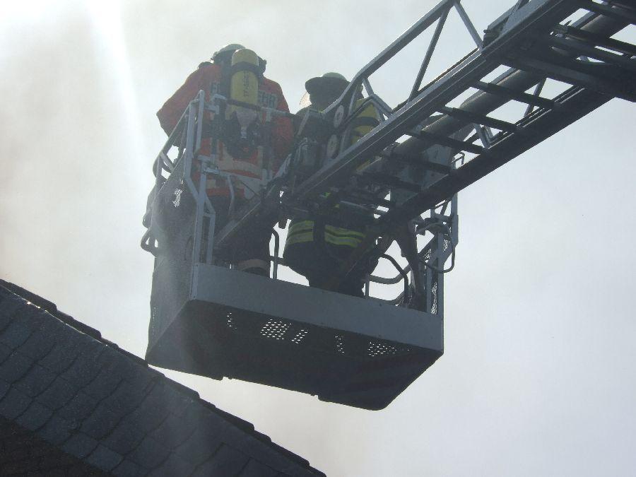 Zunächst galt es ein Übergreifen auf das unmittelbar angrenzende Wohnhaus zu verhindern. Durch Wärmestrahlung sind dort bereits die Fensterscheiben gerissen. Über die Drehleiter wurde die Brandbekämpfung im Dachbereich vorgenommen und sechs weitere Rohre wurden rings um das Gebäude eingesetzt. Ein weiterer Inneneinsatz war zu diesem Zeitpunkt nicht mehr möglich.