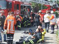 die Feuerwehrleute. Trotz des schönen Wetters und des leichten Windes müssen sie schweren Atemschutz anlegen. Kolleginnen