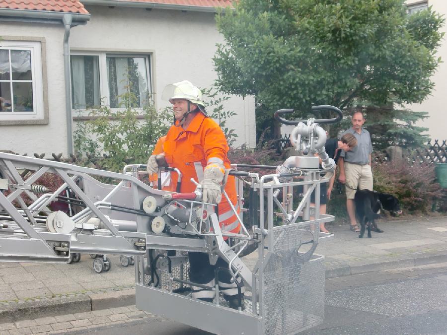 Wieder zurück zu Hause galt es das brennende Holzhaus abzulöschen. Routiniert griff sich Kamerad Tölke das Strahlrohr und löschte aus dem Korb der Drehleiter die Flammen.