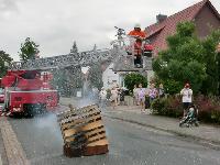 Um Ihren Kameraden nach über 25-jähriger Dienstzeit aus dem aktiven Dienst gebührend zu verabschieden haben sich die Mitglieder der Ortsfeuerwehr einiges einfallen lassen. Zunächst wurde Kamerad Tölke zu Hause abgeholt um sich, eskortiert von Feuerwehrfahrzeugen, am Feuerwehrhaus auszurüsten für seinen letzten Einsatz. Währenddessen wurde vor seiner Haustür ein hölzernes Miniaturhaus in Brand gesteckt.
