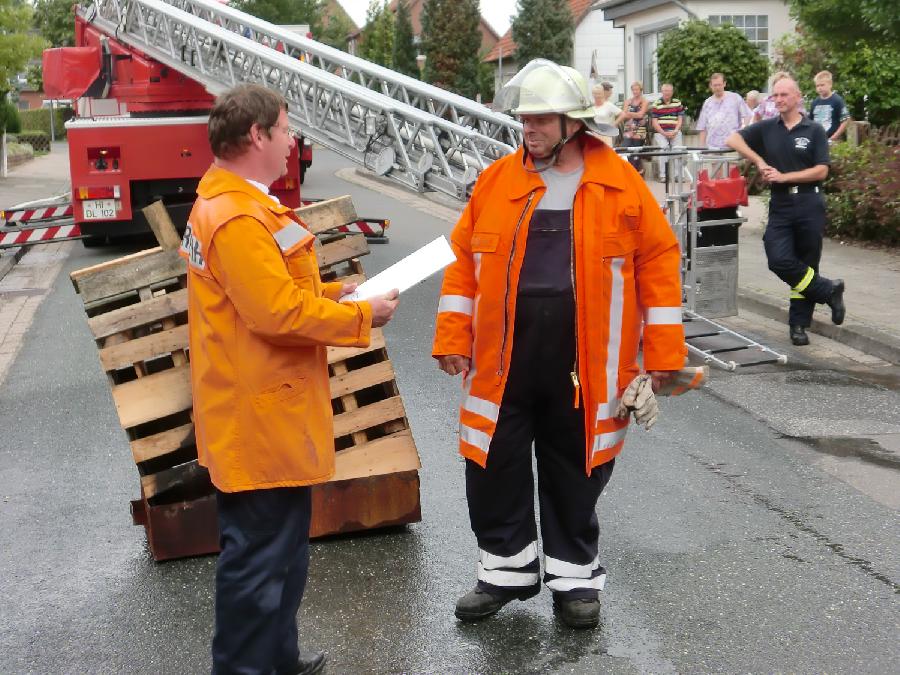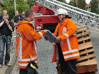 Nach absolviertem Löscheinsatz wurde dem Kameraden Tölke noch eine besondere Ehrung zuteil. Aufgrund seiner Verdienste um das leibliche Wohl seiner Kameraden ernannte Ihn Ortsbrandmeister Friedhelm Ulrich zum Ehrenküchenchef und überreichte dazu eine Urkunde und ein passendes Funktionsabzeichen. Jugendfeuerwehrwart René Blümel bedankte sich im Namen der Jugendfeuerwehr für seine tatkräftige Unterstützung und überreichte ein Präsent.