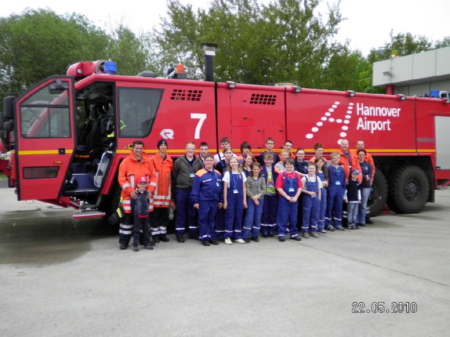 Heute besuchte die Jugendfeuerwehr mit 18 Mitgliedern und 9 Betreuern die Flughafenfeuerwehr in Hannover. Zuerst ging es mit einem Bus übers Rollfeld direkt zum Standort der Feuerwehr. Man konnte auf dem Weg dorthin einige Flugzeuge beim Starten und Landen beobachten, sowie wie sie getankt bzw. das Gepäck abgefertigt wurde.
