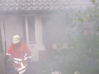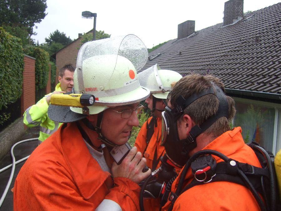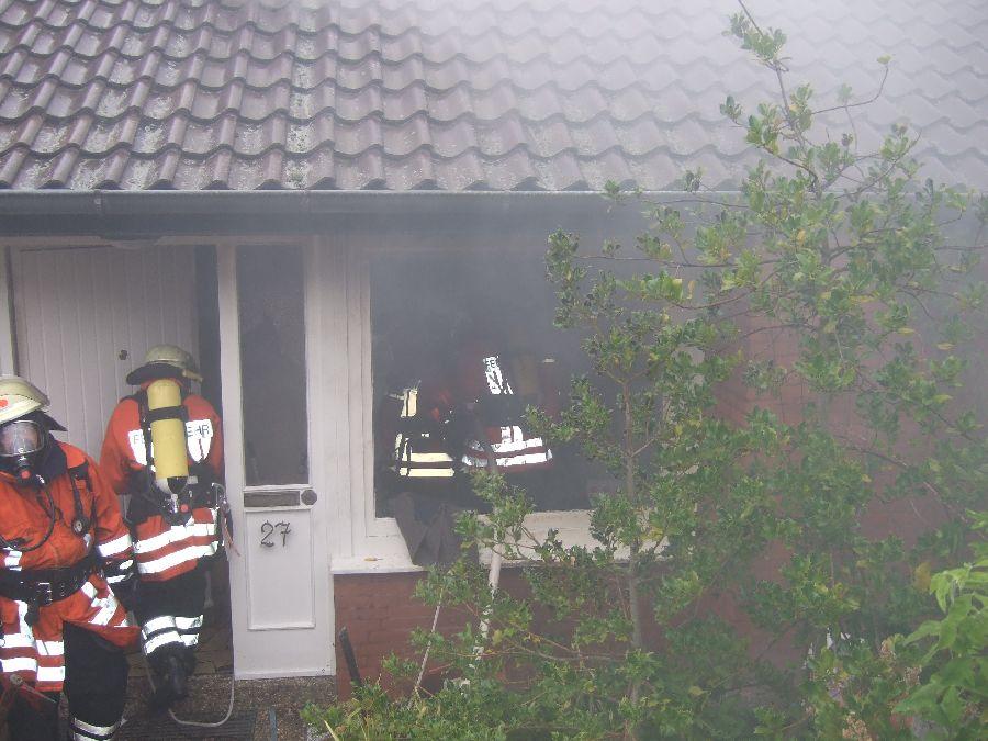 Zunächst war unklar, ob der Hauseigentümer sich noch im Gebäude befindet. Die Gruppe des Tanklöschfahrzeuges erhielt den Auftrag, eine kombinierte Menschensuche und Brandbekämpfung von der Vorderseite aus durchzuführen. Nach gewaltsamer Öffnung der Eingangstür gingen 2 Trupps in das Gebäude vor. Die Besatzung der Drehleiter brachte einen Überdrucklüfter in Stellung, um den Brandbereich zu entrauchen.