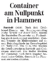 Nach dem heißen Brand am Vormittag ging es etwas weniger spektakulär weiter. Ein Müllcontainer auf einem Betriebsgelände im Gewerbegebiet am Nullpunkt brannte. Um 15:15 Uhr wurden die Ortsfeuerwehren Sarstedt und Gödringen alarmiert. Der Container wurde abgelöscht, eine Ausbreitungsgefahr bestand nicht.