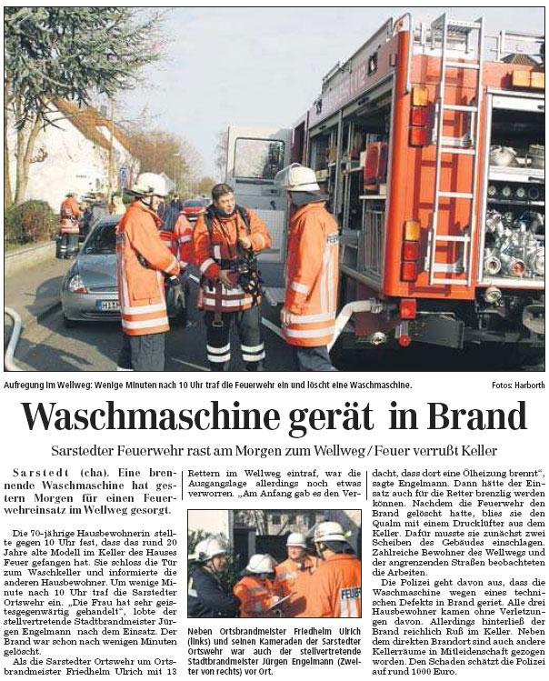 Die 70-jährige Hausbewohnerin stellte gegen 10 Uhr fest, dass das rund 20 Jahre alte Modell im Keller des Hauses Feuer gefangen hat. Sie schloss die Tür zum Waschkeller und informierte die anderen Hausbewohner. Um wenige Minute nach 10 Uhr traf die Sarstedter Ortswehr ein. Die Frau hat sehr geistesgegenwärtig gehandelt, lobte der stellvertretende Stadtbrandmeister Jürgen Engelmann nach dem Einsatz. Der Brand war schon nach wenigen Minuten gelöscht.