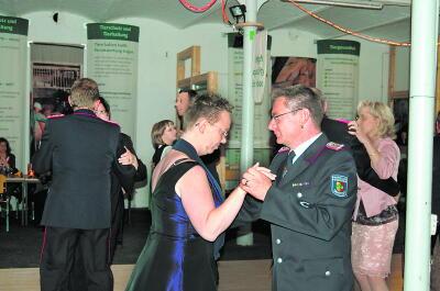 Auf der Tanzfläche geht es inzwischen hoch her. Uwe Meyer bittet alle Ortsbrandmeister mit Partnerinnen nach vorn. Mit einem Disco-Fox eröffnen sie den Tanz. Schnell kommen noch andere hinzu, um die Kameraden auch bei dieser schwierigen Aufgabe zu unterstützen. Heike und Bernd Heinrich von Musikexpress sorgen mit dem Partyklassiker Movie Star für Stimmung. Die beiden Musiker sind aus Bad Sachsa im Harz angereist, um die Feuerwehr in Schwung zu bringen. Wir sind Berufsmusiker und mehrmals in der Woche unterwegs, erklärt die Sängerin. Das nächste Mal kommen sie zum Winterball der Feuerwehr Ruthe Anfang kommenden Jahres nach Sarstedt.