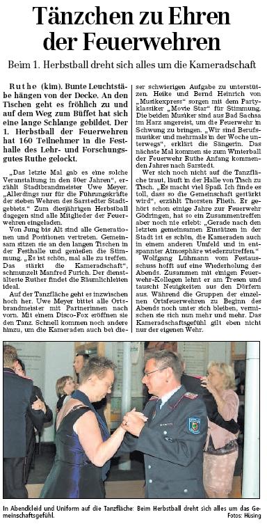 Ruthe (kim). Bunte Leuchtstäbe hängen von der Decke. An den Tischen geht es fröhlich zu und auf dem Weg zum Büffet hat sich eine lange Schlange gebildet. Der 1. Herbstball der Feuerwehren hat 160 Teilnehmer in die Festhalle des Lehr- und Forschungsgutes Ruthe gelockt.