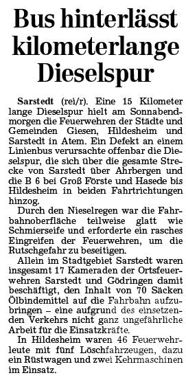 Eine kilometerlange Ölspur hielt am Samstagmorgen die Feuerwehren der Städte und Gemeinden Giesen, Hildesheim und Sarstedt in Atem. Ein Defekt an einem Linienbus verursachte die Dieselspur die sich über die gesamte Strecke Hildesheim-Sarstedt in beiden Fahrtrichtungen hinzog. Durch den Nieselregen war die Fahrbahnoberfläche teilweise glatt wie Schmierseife und erforderte ein rasches Eingreifen der Feuerwehren um die Ruschgefahr zu beseitigen. Im Bereich des Stadtgebietes Sarstedt waren insgesamt 17 Kameraden der Ortsfeuerwehren Sarstedt und Gödringen damit beschäftigt den Inhalt von 70 Säcken Ölbindemittel auf die Fahrbahn aufzubringen, eine aufgrund des einsetzenden Verkehrs nicht ganz ungefährliche Arbeit für die Einsatzkräfte.