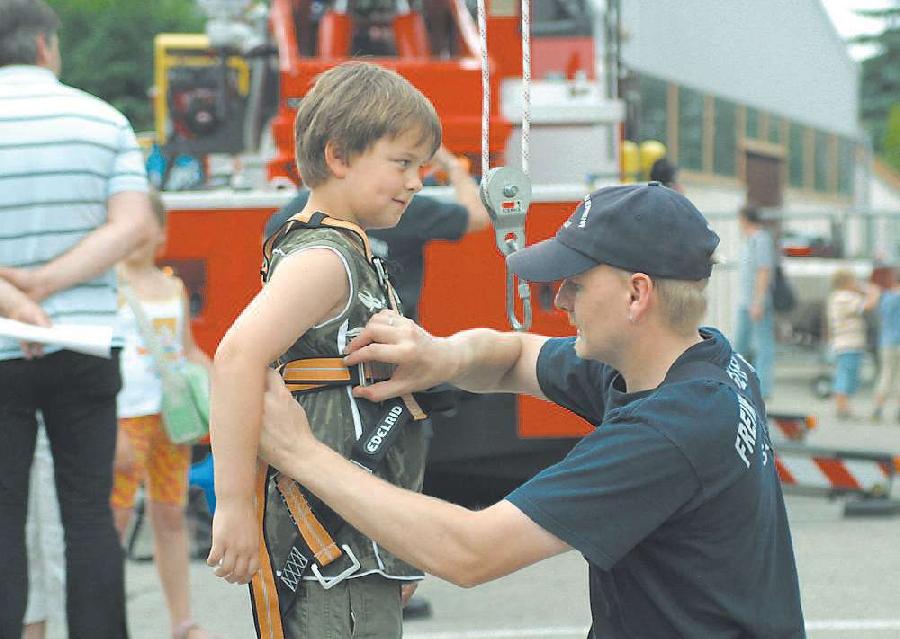 Sarstedt (cha). Tag der offenen Tür bei der Feuerwehr Sarstedt und alle wollen hin: Besucher von nah und fern sind gestern zur Sarstedter Feuerwache geströmt, um Lösch- und Bergegerät zu begutachten oder eine Runde mit dem Einsatzfahrzeug zu drehen. Höhepunkt war unter anderem die Fahrt mit der Drehleiter.