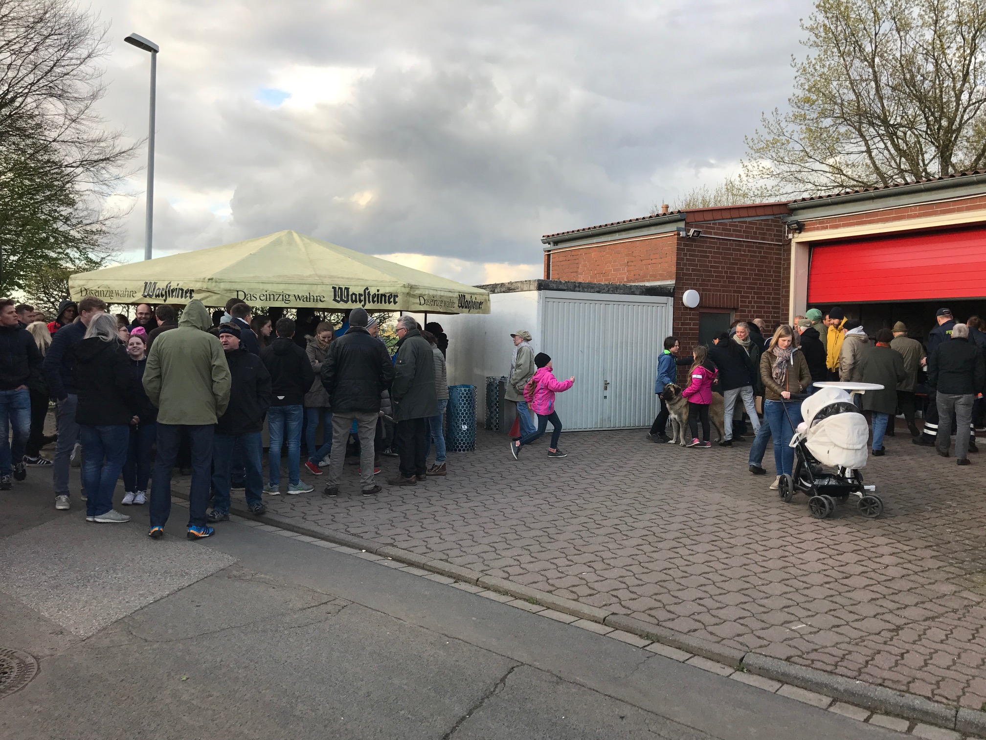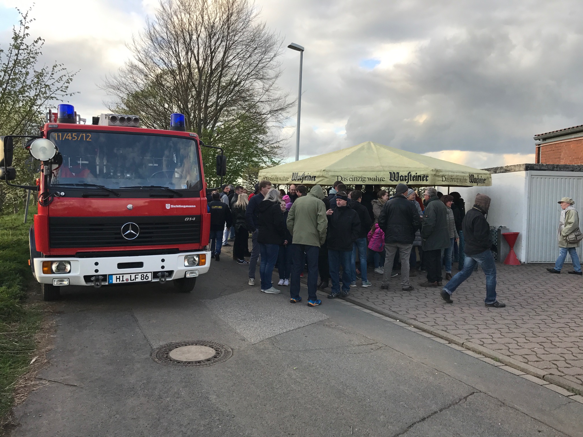 Traditionell richtet die Feuerwehr Gödringen am Ostersamstag das Osterfeuer im eigenen Ort aus. Morgens um 9h treffen sich die aktiven Mitglieder zur Strauchschnittannahme und zum Aufbau für das Osterfeuer. Die Aktiven wurden gegen 11:25h zu einer Hilfeleistung Ölspurbeseitigung alarmiert. Kurzer Hand wurde sich aufgeteilt, ein Teil der Aktiven blieb am Feuerwehrhaus und bereitete das Osterfeuer weiterhin vor und ein anderer Teil machte sich unter Leitung von Ortsbrandmeister Sebastian Will auf den Weg zur Einsatzstelle. Nach einer kurzen Erkundung konnten die Feuerwehren Hotteln und Heisede abbestellt werden. Durch die Leitstelle wurde für diesen Einsatz Zugalarm ausgelöst. Die Einsatzkräfte streuten 18 Sack Ölbindemittel auf die Straße, die Kehrmaschine der Stadt Sarstedt nahm das Bindemittel wieder auf. Da die Ölspur Richtung Sarstedt weiterging, wurde eine Firma für die Beseitigung der Ölspur außerhalb der geschlossenen Ortschaft beauftragt. Die Polizei war ebenfalls vor Ort. Nach Abarbeitung des Einsatzes konnte dann das gemeinsame Frühstück nachgeholt werden. Beim Osterfeuer hatten die kleinen Besucher sichtlich Spaß bei Zubereiten von leckerem Stockbrot. Schinkengriller, Bratwurst, Bratcurry und Fleisch wurde auf dem Grill zubereitet. Pommes und verschiedene Getränke rundeten das Angebot ab. Pünktlich um 18h wurde das Feuer entfacht und die Mitglieder der Einsatzabteilung hatten bis in die späten Abendstunden ordentlich zu tun, die gut besuchte Veranstaltung mit Essen und Trinken zu versorgen. Die Feuerwehr Gödringen möchte sich bei allen bedanken, die zum Erfolg des Osterfeuers etwas beigetragen haben und die Veranstaltung unterstützten.