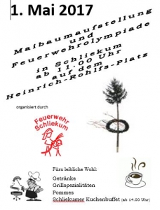 Am 1. Mai 2017 stellt die Feuerwehr Schliekum ab 11 Uhr den Maibaum vor dem Feuerwehrhaus auf. Herzlich willkommen sind alle, die bei Gegrilltem, Pommes, Getränken sowie Kaffee und Kuchen einen schönen Tag verbringen möchten. Erstmalig wird in Schliekum an diesem Tag die Feuerwehrolympiade für Jedermann durchgeführt.
