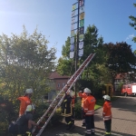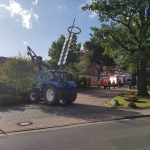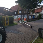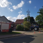 Mit beiden Fahrzeugen rückten ca. 10 Kameraden aus um nach Absicherung des Bereiches um den Maibaum ein Seil zu befestigen. Mittels der Seilwinde am RW1 und Unterstützung eines Treckers, der mit einer Umlenkrolle das Seil führte, sowie vereinten Kräften einiger Kameraden von der Gegenseite konnte der Maibaum sanft zu Boden gekippt werden.