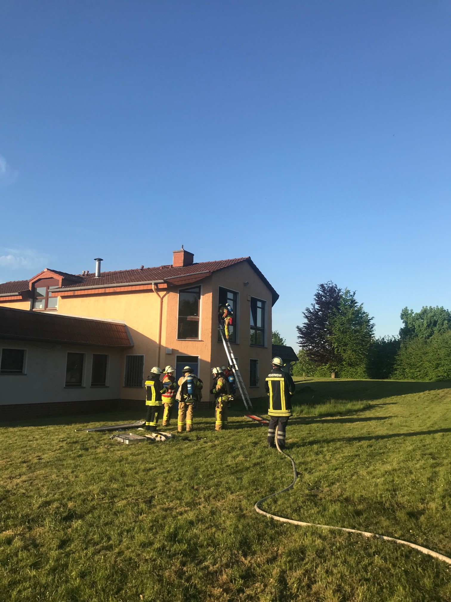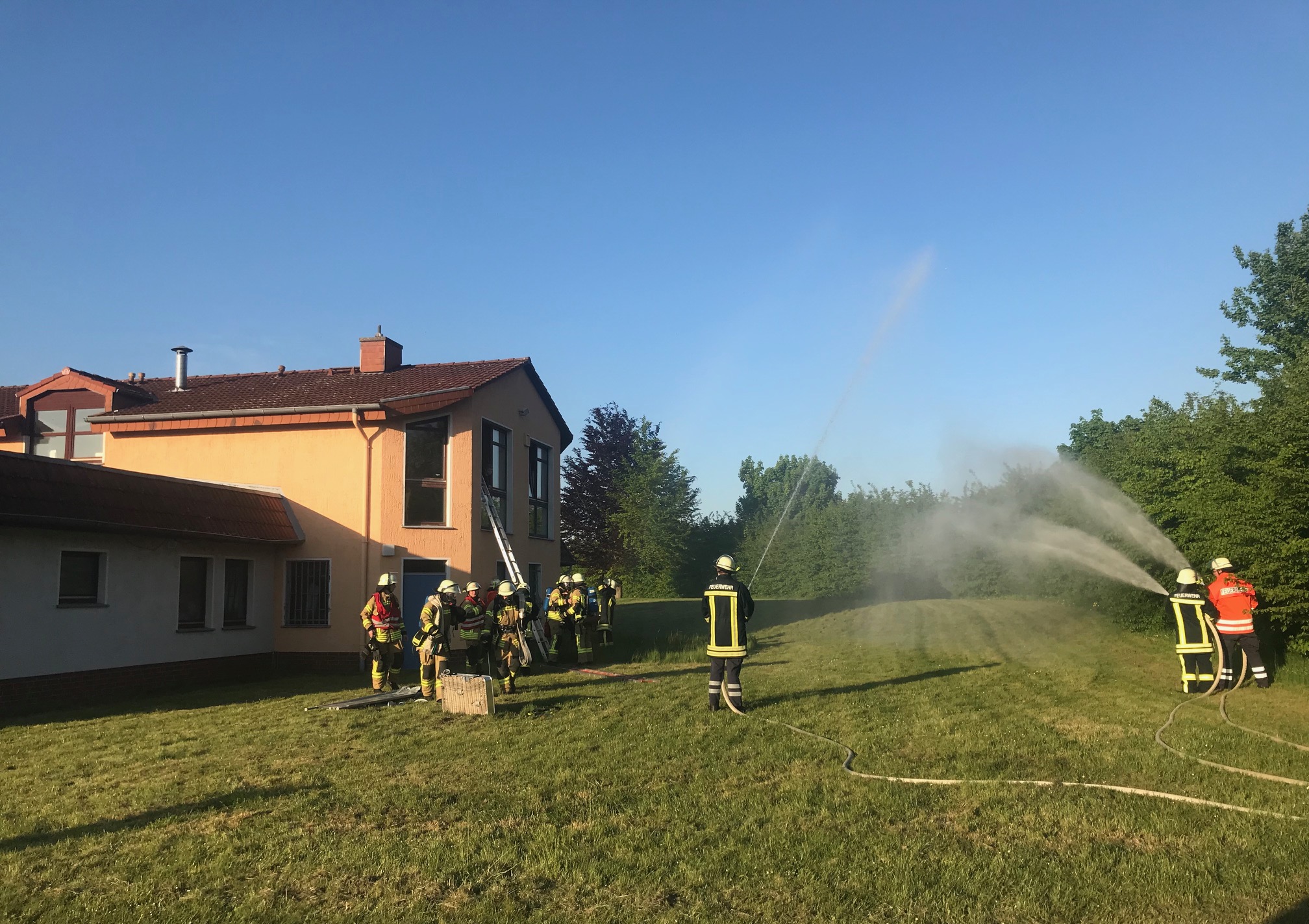 Geübt wurde die Menschenrettung unter Atemschutz aus dem 1. OG und dem EG, die Betreuung der Verletzten, die Brandbekämpfung und die Riegelstellung zu den benachbarten Bereichen. Das Löschwasser musste über eine längere Strecke zum Übungsobjekt gefördert werden.