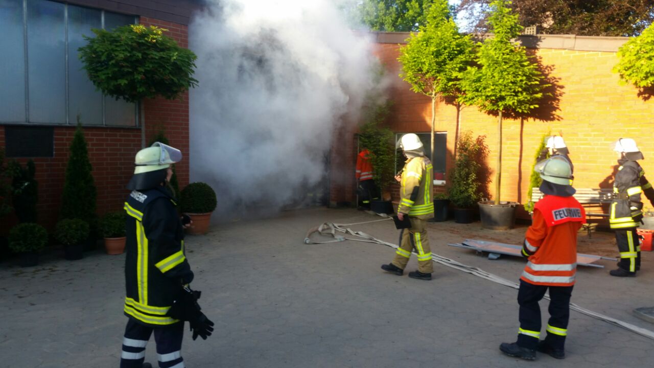 Sofort wurde eine Personenrettung unter Atemschutz eingeleitet, parallel wurde eine Wasserversorgung von der St.-Nikolai-Str. aus errichtet. Nach kurzer Zeit konnte die vermisste Person durch den vorgehenden Trupp gerettet werden, ein weiterer Trupp wurde zur Brandbekämpfung in das Objekt entsandt. Nach gut einer Stunde war die Übung erfolgreich abgeschlossen und wurde mit einer Nachbesprechung beendet