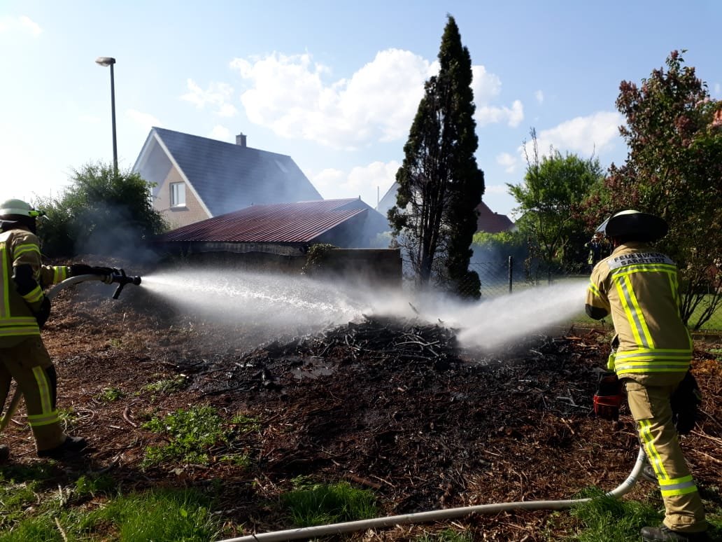 Auch wenn nur wenige Minuten vergingen, bis der Rüstwagen an der Einsatzstelle eintraf, schlugen bereits die Flammen meterhoch aus dem Schredderhaufen und drohten, den angrenzenden Geräteschuppen des Nachbarn samt Kraftstoffen sowie Büsche, Tannen und Bäume in Brand zu setzen und damit auf die umliegenden Häuser überzugreifen.