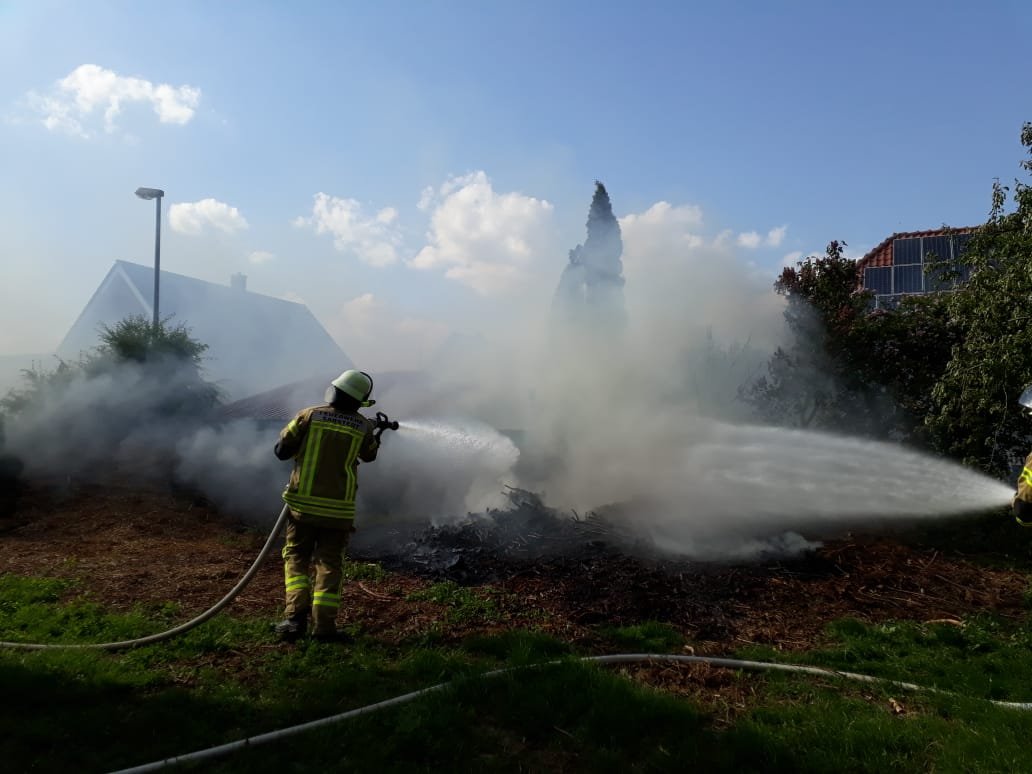 So auch gestern Nachmittag in Hotteln passiert. Ein Haufen Schreddergut auf dem Grundstück der Gärtnerei Ruddigkeit am Distelberg hatte sich vermutlich selbst entzündet. Die Rauchwolke wurde von einem Hottelner Jogger entdeckt, der gerade mit seiner Schwester eine Runde gelaufen war. Schnell war klar, das war kein Grillrauch. Auf etwa einem Quadratmeter schmorte es schon. Sofort alarmierten sie über Nachbarn die Feuerwehr und der joggende Feuerwehrmann Alex Holten rannte direkt weiter zum Gerätehaus.