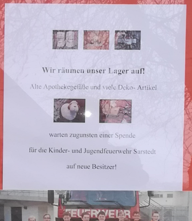 Ende März wird Frau Krätzig ihre Ratsapotheke leider schließen. Deshalb hat sie einen Ausverkauf aller Dekorationsartikel gestartet. Wer also noch ein Tongefäß, ein Deko-Schaf oder eine Aspirin-Verpackung im XXL Format gebrauchen kann ist hier gut aufgehoben. Aber das Beste ist natürlich, dass der Erlös dieses Verkaufs an den Förderverein der Ortfeuerwehr Sarstedt überreicht wird.