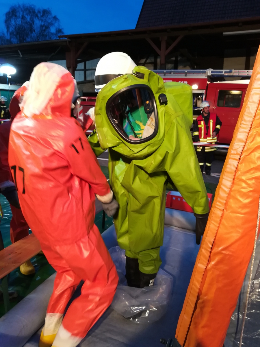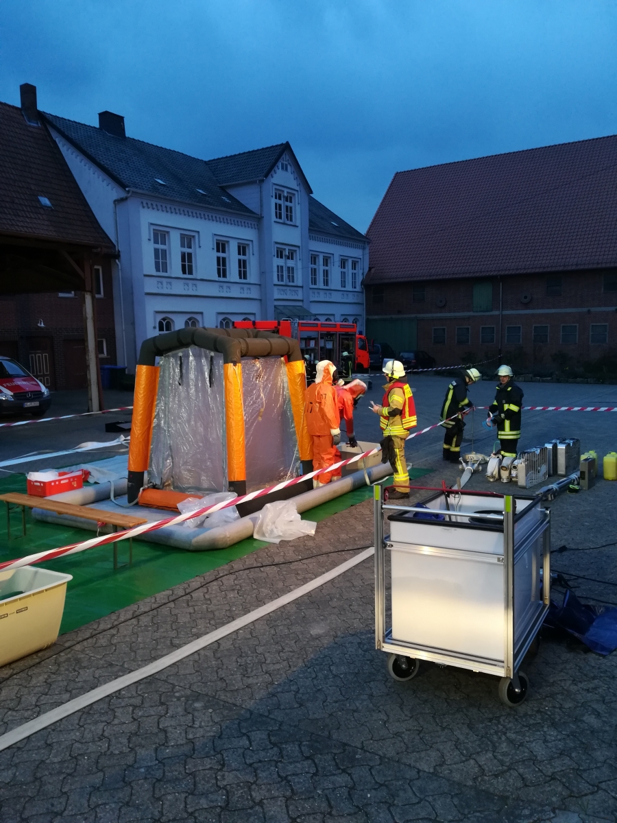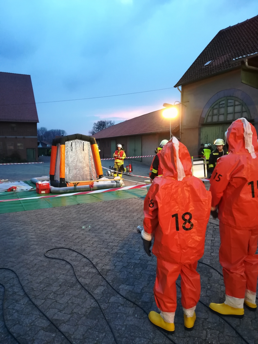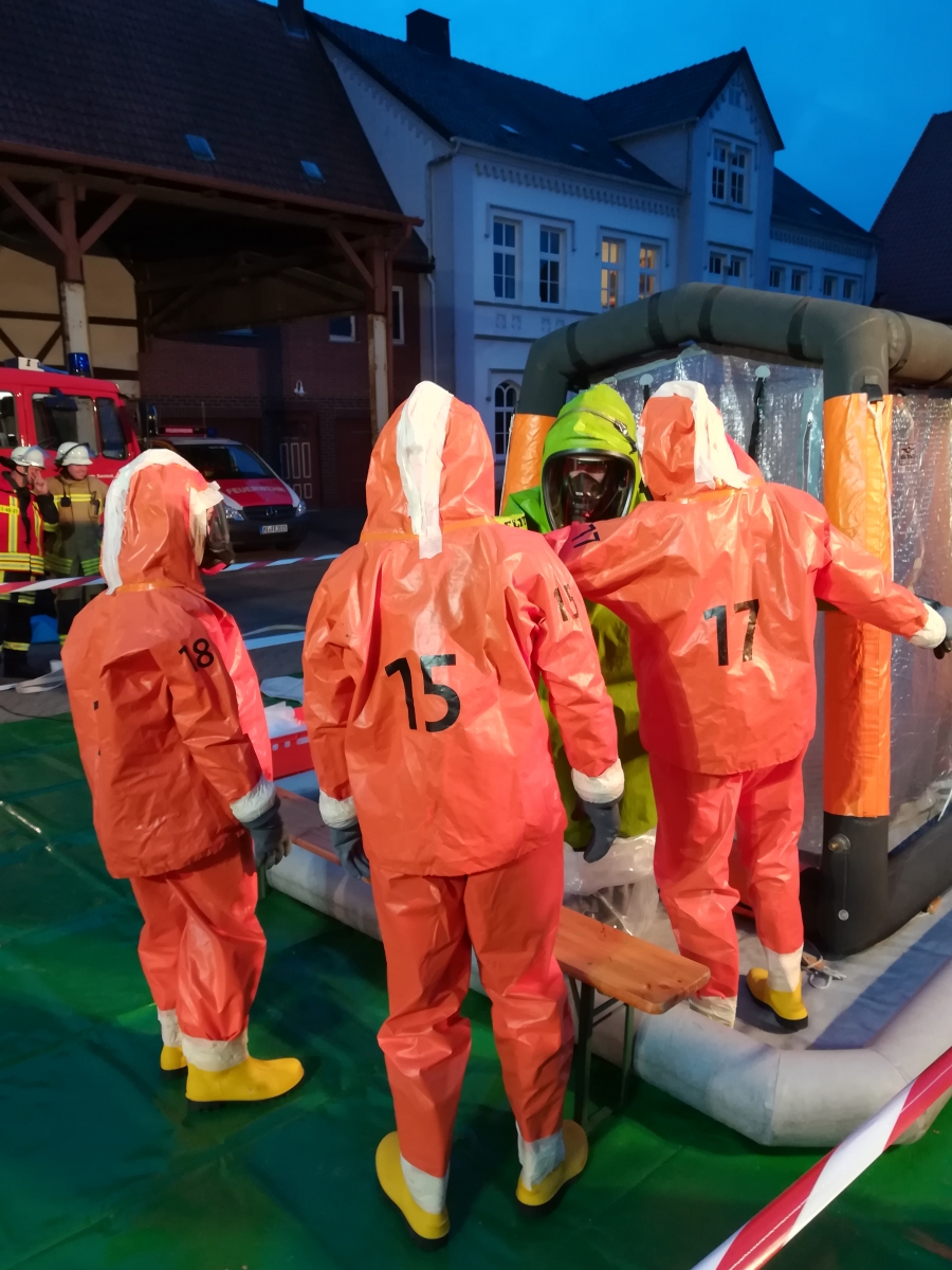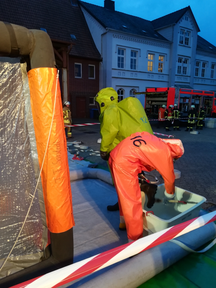 Nach dem Übungsszenario trat ein zunächst unbekannter Gefahrstoff aus, so dass die zuständige Ortsfeuerwehr Emmerke den Gefahrgutzug Nord 1 zur Unterstützung anforderte. Die Einsatzkräfte gingen unter Chemiekalienschutzanzügen (CSA) vor. Beim Verlassen der Einsatzstelle mussten sie den Dekontaminationsplatz passieren. Hier wurden die Stiefel gereinigt, die Einsatzkräfte mussten mit dem CSA unter die Dusche und durften den CSA schließlich mit Unterstützung ablegen.
