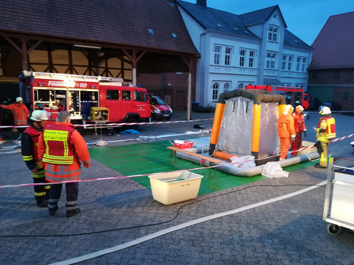 Der dritte Löschzug der Stadtfeuerwehr Sarstedt (Ortsfeuerwehren Giften, Ruthe und Schliekum) ist bei Einsätzen des Gefahrgutzugs Nord 1 für die Dekontamination der Einsatzkräfte zuständig, falls die Einsatzkräfte oder deren Schutzkleidung im Verlauf des Einsatzes mit Gefahrstoffen in Berührung kommen. Beim Zugdienst des Gefahrgutzugs wurde diese Dekontamination trainiert. Hierzu galt es, einen Dekontaminationsplatz aufzubauen, der aus Planen, verschiedenen Auffangbehältern und einem Duschzelt bestand, und anschließend zu betreiben.
