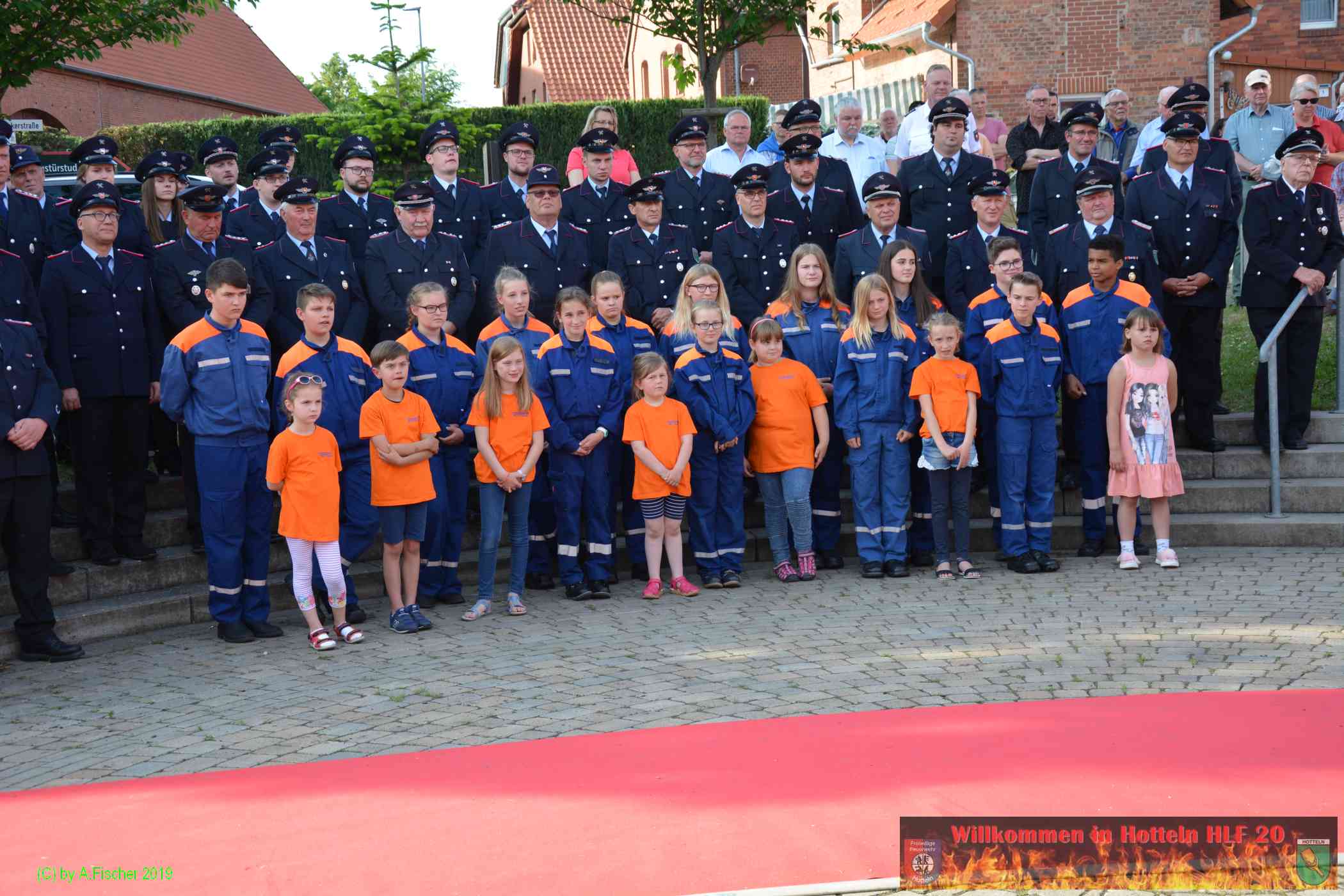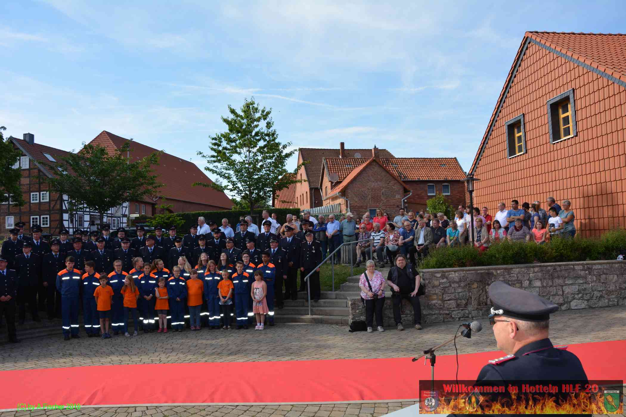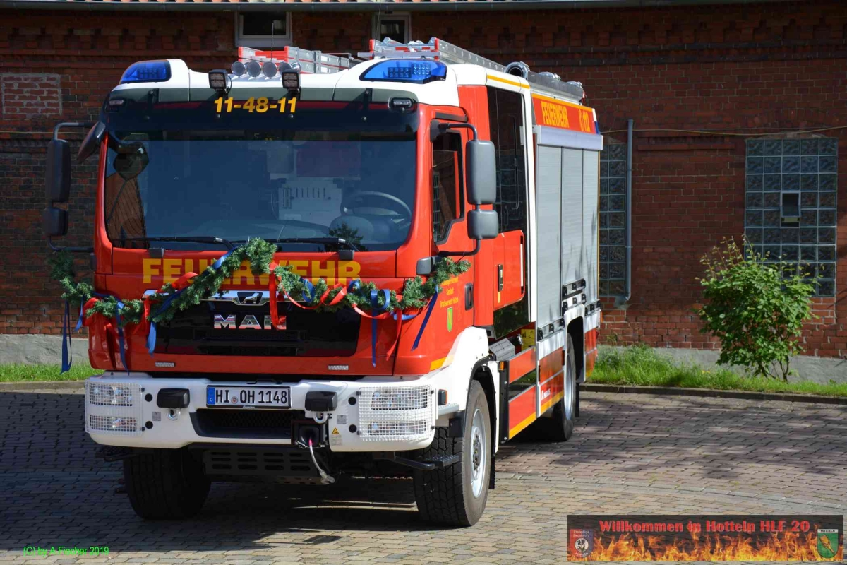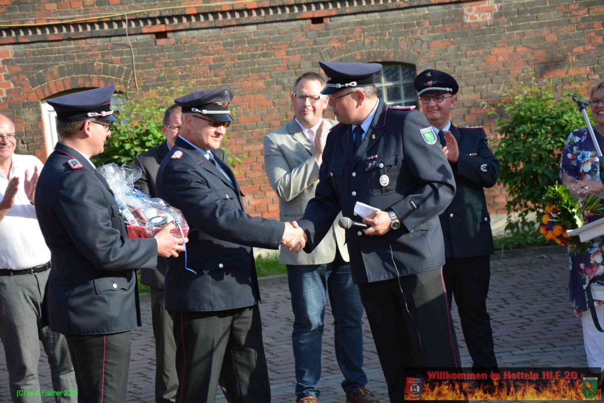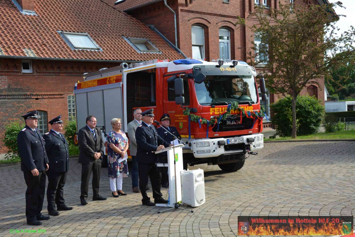 Am 1. Juni 2019 um 18:15 Uhr eröffnete Ortsbrandmeister Jens Klug die offizielle Fahrzeugübergabe des HLF 20 an die Ortsfeuerwehr Hotteln bei strahlendem Sonnenschein auf dem Platz vor dem Hottelner Dorfgemeinschaftshaus. Gut 150 aktive und passive Kameradinnen und Kameraden samt Jugendfeuerwehr und Löschteufeln versammelten sich dazu und wurden von der Feuerwehr Blaskapelle Achtum-Uppen auf diesen feierlichen Akt eingestimmt.