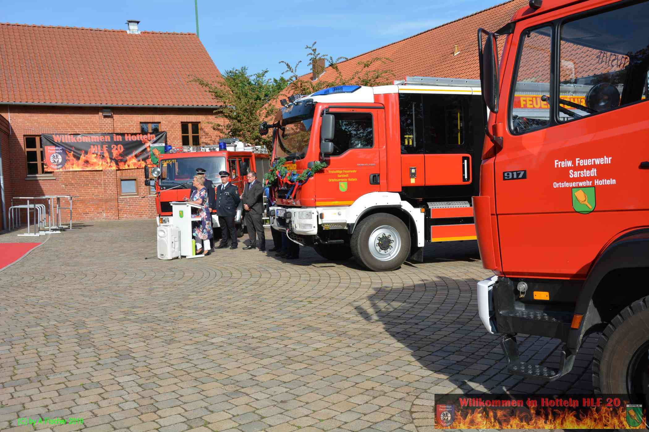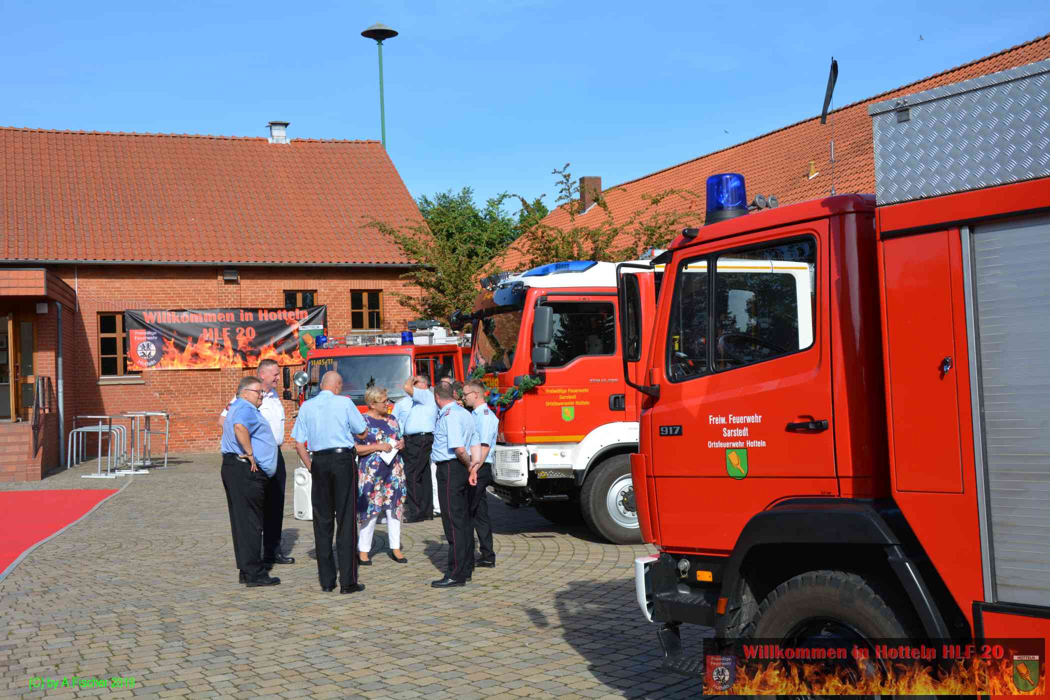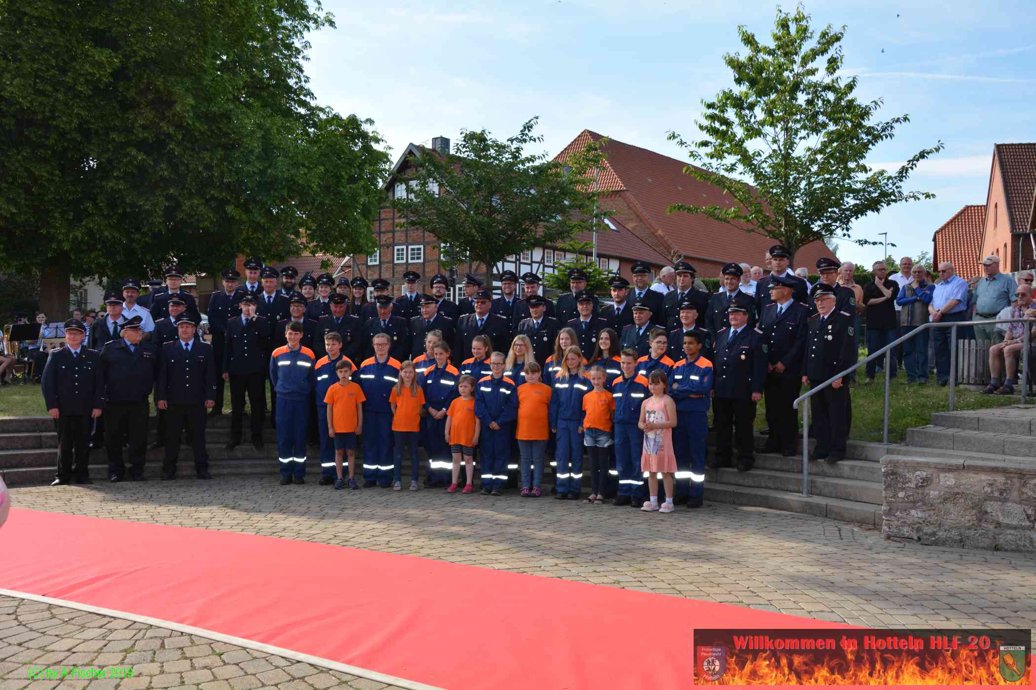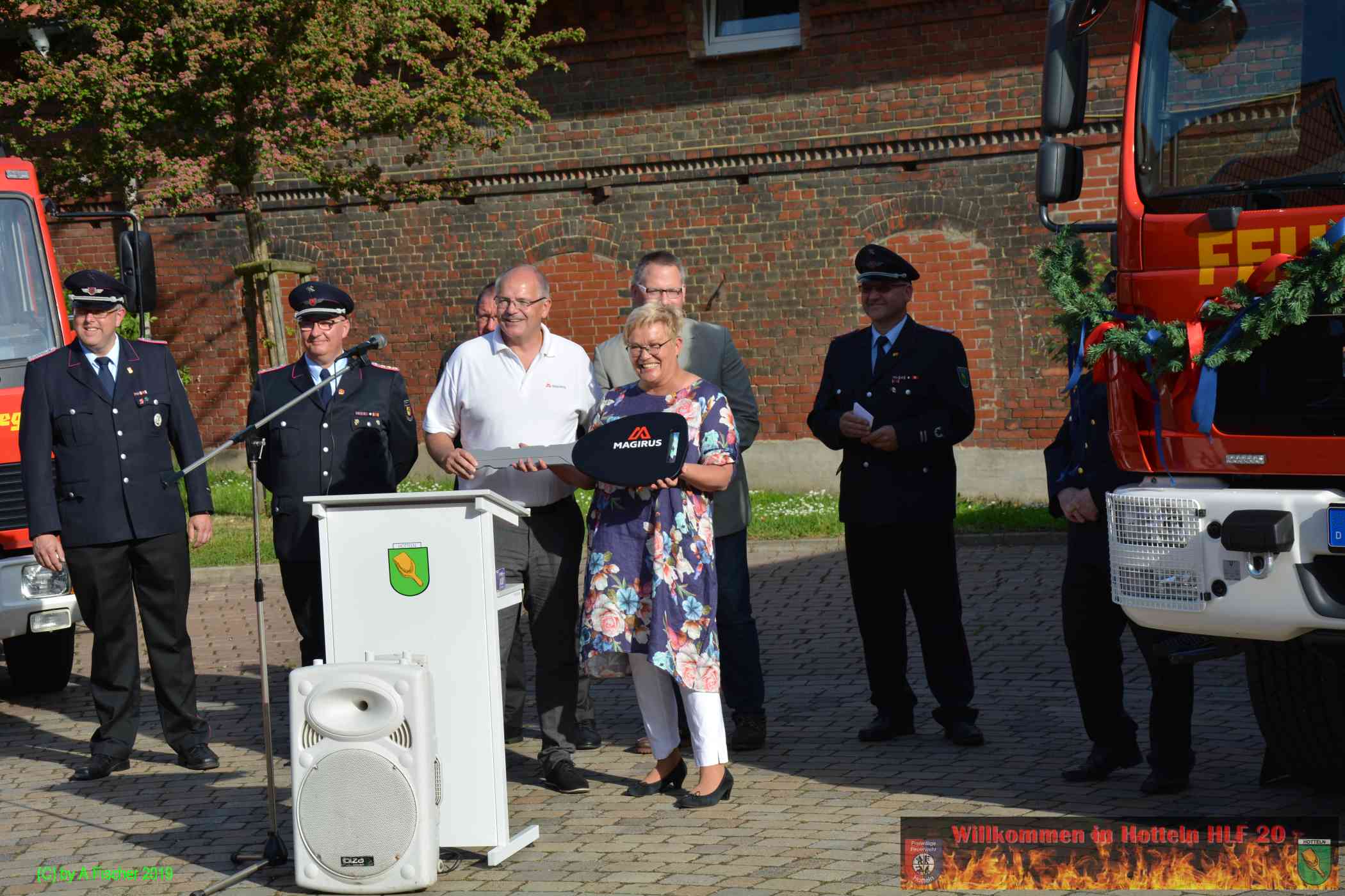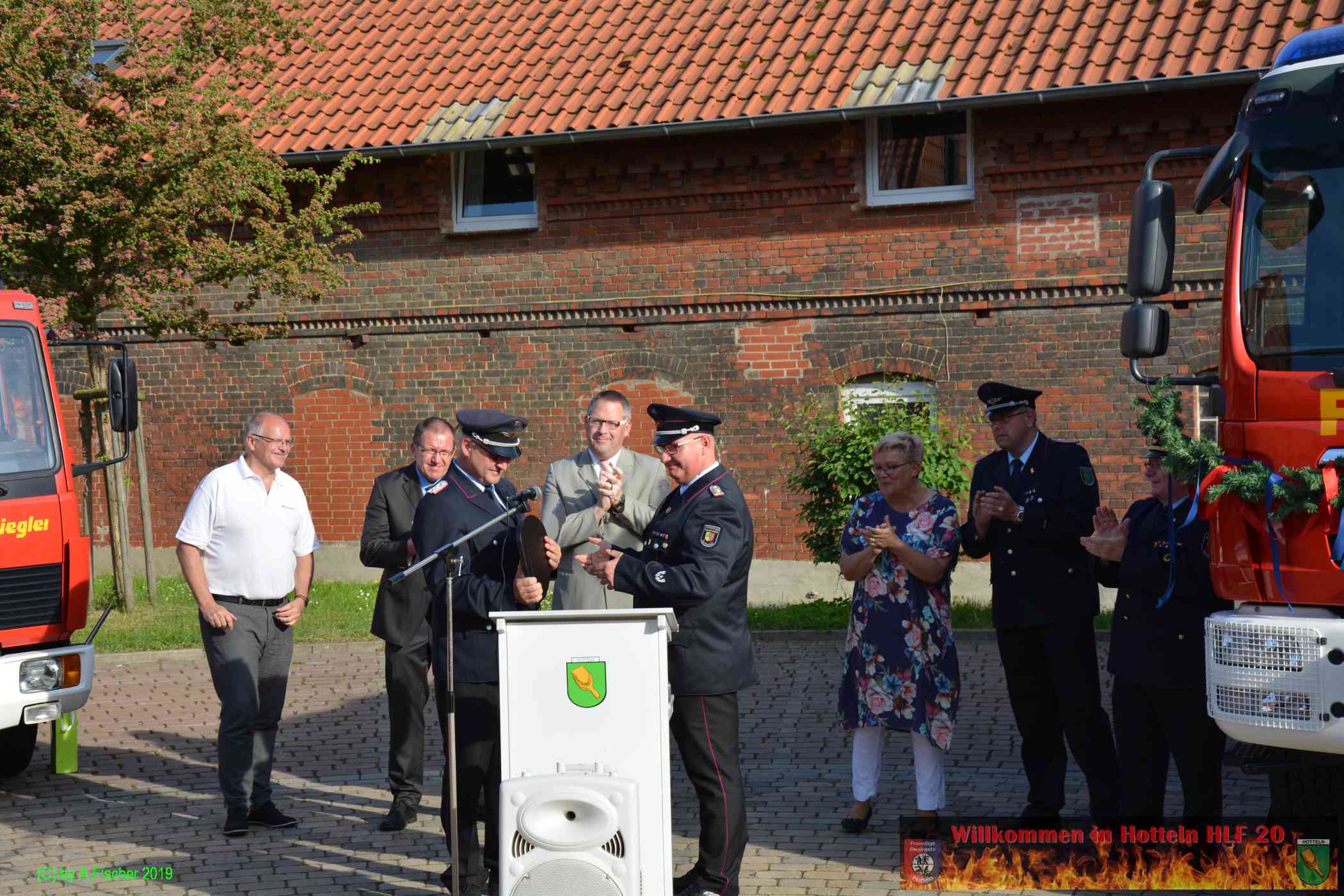 Am 1. Juni 2019 um 18:15 Uhr eröffnete Ortsbrandmeister Jens Klug die offizielle Fahrzeugübergabe des HLF 20 an die Ortsfeuerwehr Hotteln bei strahlendem Sonnenschein auf dem Platz vor dem Hottelner Dorfgemeinschaftshaus. Gut 150 aktive und passive Kameradinnen und Kameraden samt Jugendfeuerwehr und Löschteufeln versammelten sich dazu und wurden von der Feuerwehr Blaskapelle Achtum-Uppen auf diesen feierlichen Akt eingestimmt.