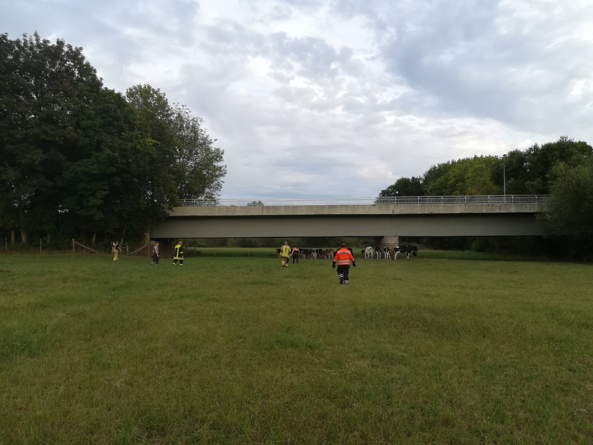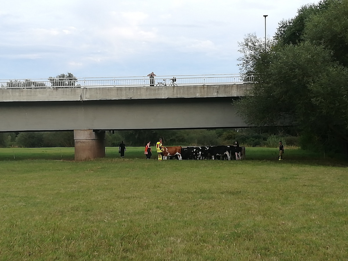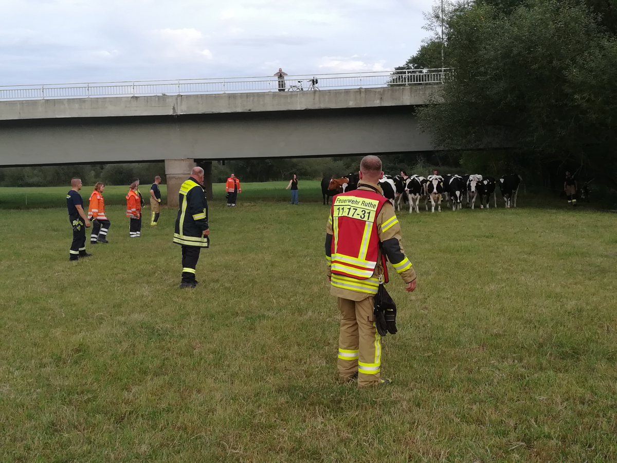 Unter fachkundiger Anleitung von Mitarbeitern des Lehr- und Forschungsguts Ruthe konnten die Einsatzkräfte die Herde an die Böschung führen, um die Kuh zur Rückkehr zu ihrer Herde zu bewegen. Gleichzeitig trieben die gesicherten Einsatzkräfte die bereits sichtlich erschöpfte Kuh in der Leine stromaufwärts in Richtung Leinebrücke. Da die Böschung an dieser Stelle deutlich flacher ist, gelang es der Kuh schließlich, mit letzter Kraft an Land zu klettern.