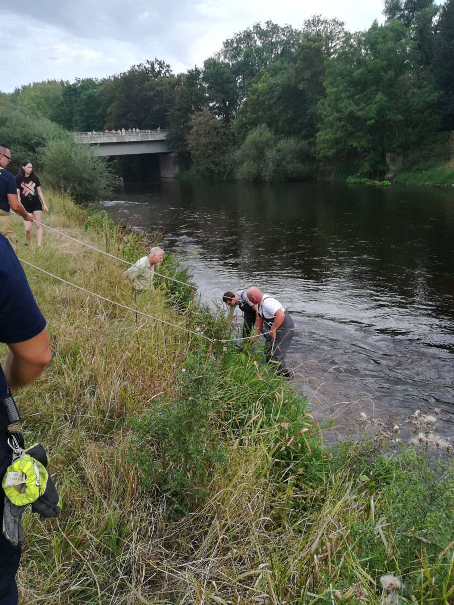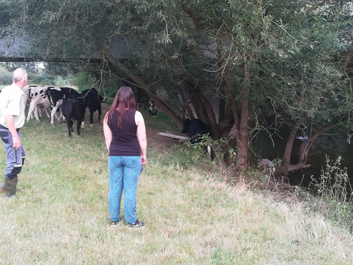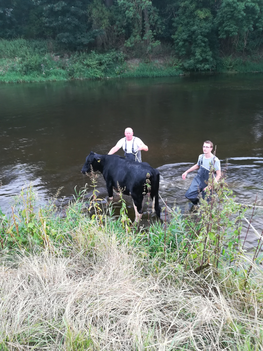 Unter fachkundiger Anleitung von Mitarbeitern des Lehr- und Forschungsguts Ruthe konnten die Einsatzkräfte die Herde an die Böschung führen, um die Kuh zur Rückkehr zu ihrer Herde zu bewegen. Gleichzeitig trieben die gesicherten Einsatzkräfte die bereits sichtlich erschöpfte Kuh in der Leine stromaufwärts in Richtung Leinebrücke. Da die Böschung an dieser Stelle deutlich flacher ist, gelang es der Kuh schließlich, mit letzter Kraft an Land zu klettern.