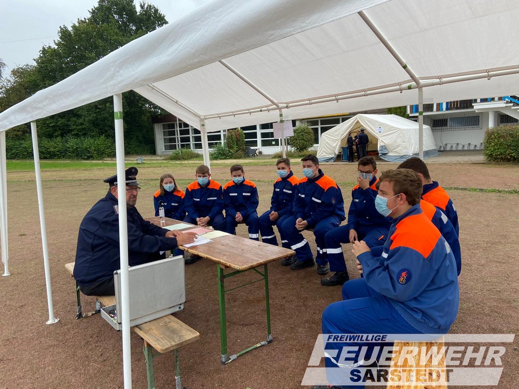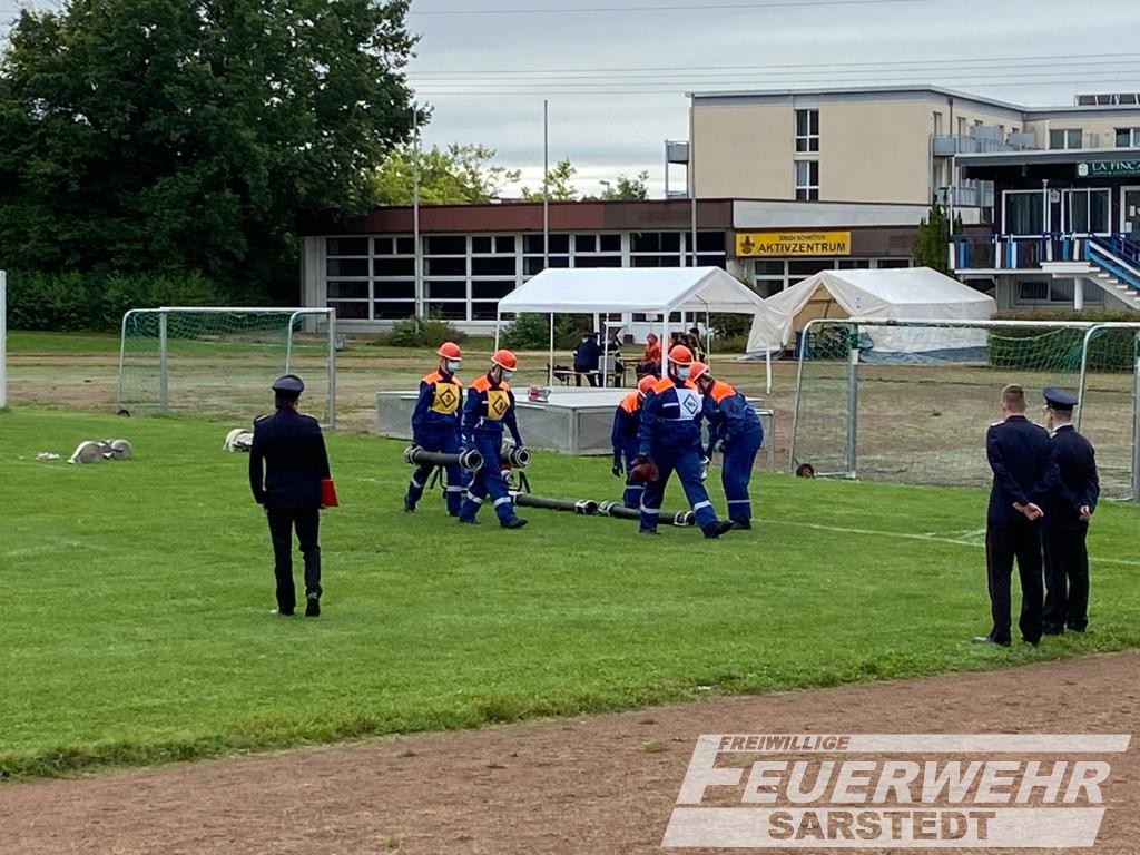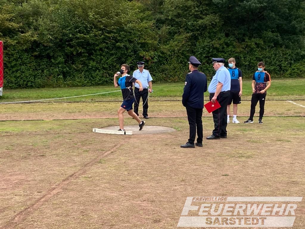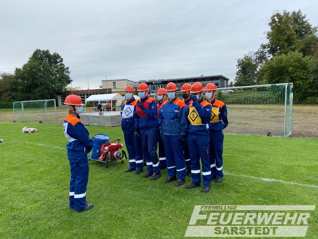 Für die Gruppe aus Sarstedt und Gödringen ging es heute früh um 07.30 Uhr los. Getroffen wurde sich am Feuerwehrhaus in Sarstedt. Es ging nach Itzum. Auf dem dortigen Sportplatz durften unter Einhaltung der Hygienemaßnahmen die fünf zu absolvierenden Aufgaben durchgeführt werden. Für die Gruppe aus Sarstedt und Gödringen ging es als erstes zum Löschangriff. Hier wurde ein dreigeteilter Löschangriff nach FwDV 3 aufgebaut. Danach galt es, eine Schnelligkeitsübung sowie Fragen rund um Allgemein- und Feuerwehrwissen zu beantworten. Zum Schluss wurde es dann noch sportlich. Erst Kugelstoßen und dann Staffellauf. Nun stand es fest, alle neun Teilnehmer aus der Gruppe Sarstedt-Gödringen haben das höchste Abzeichen der Deutschen Jugendfeuerwehr verdient bestanden.