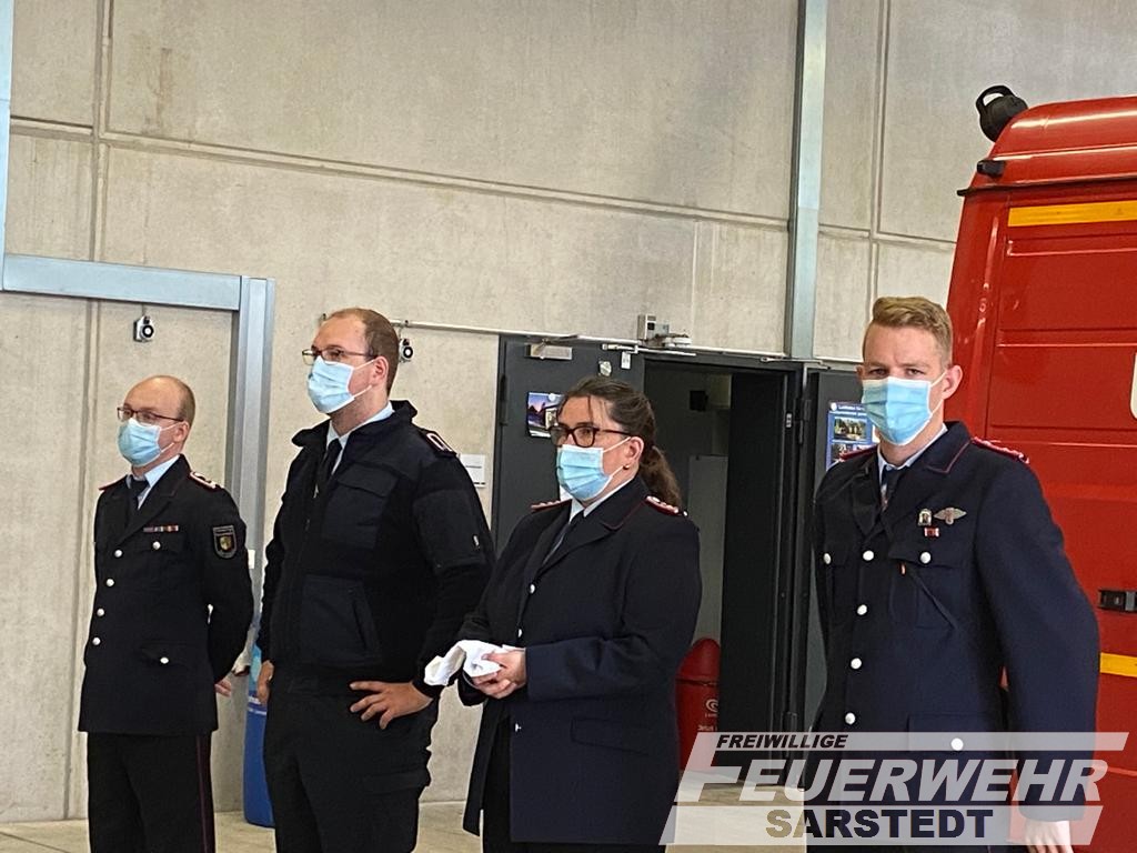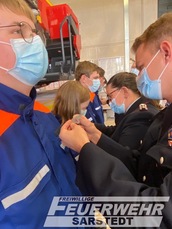 Auf dem Rückweg wurden die Jugendlichen von ihren Feuerwehren zum Frühstück für die getane Arbeit eingeladen. Am Feuerwehrhaus in Sarstedt wartete der Jugendfeuerwehrwart Pascal Schulz und begrüßte seine Schützlinge. Er konnte aufgrund einer Einschränkung der Personenzahl vor Ort leider nicht mit in Itzum sein. Nach einer kurzen Ansprache von den Jugendfeuerwehrwarten aus Sarstedt und Gödringen wurden nun die Abzeichen an die Uniform angesteckt und die besten Glückwünsche ausgesprochen.