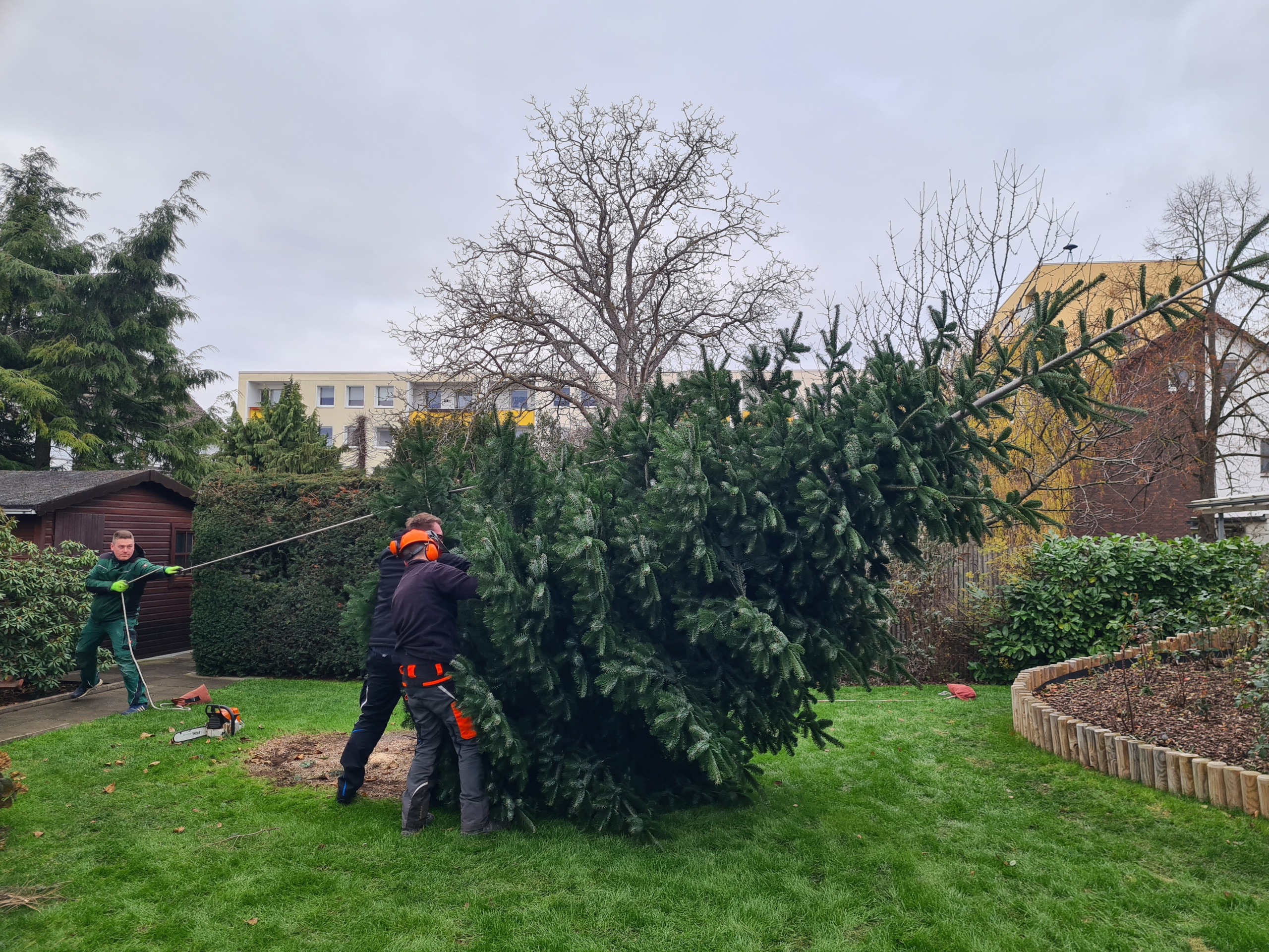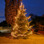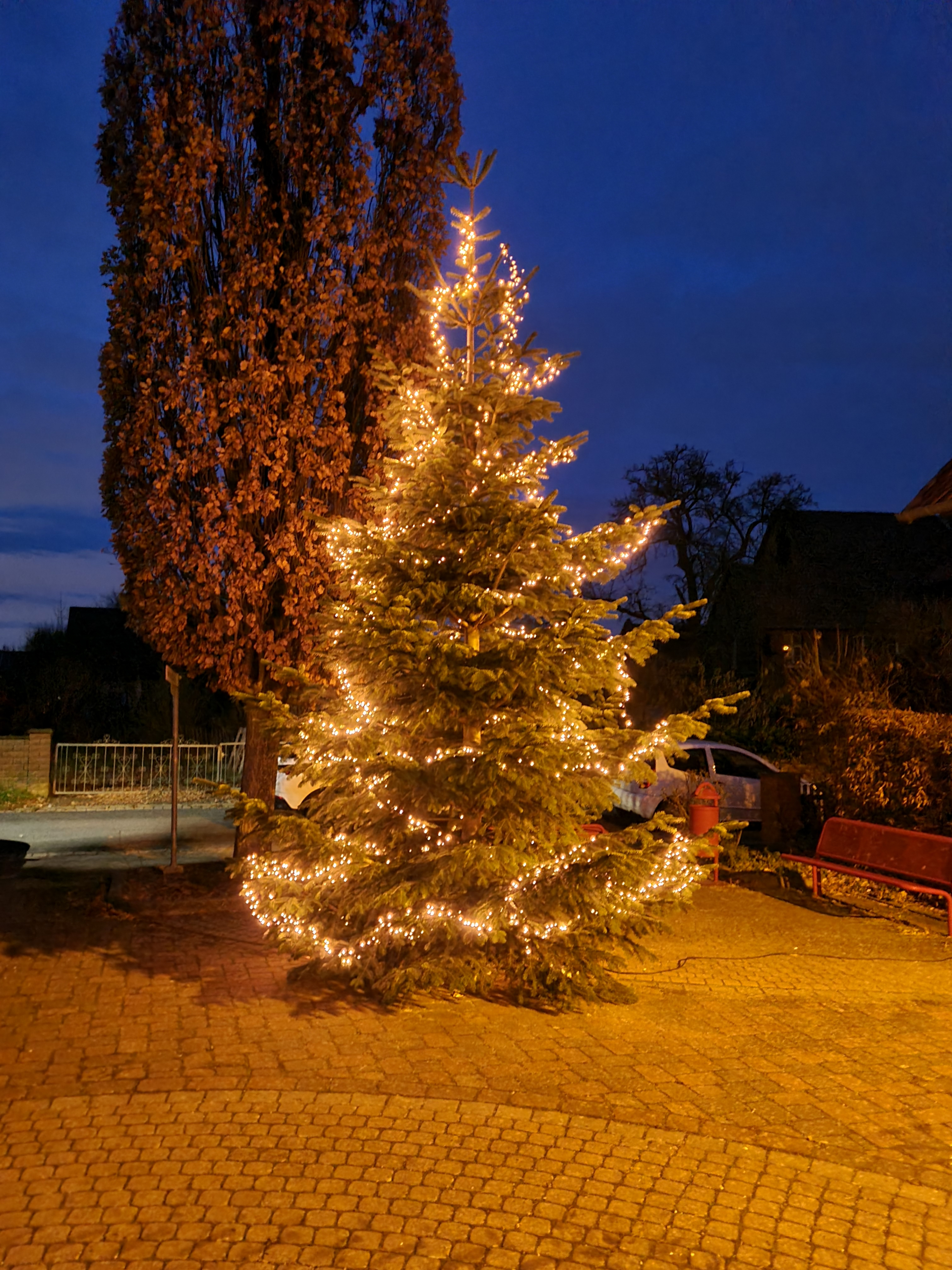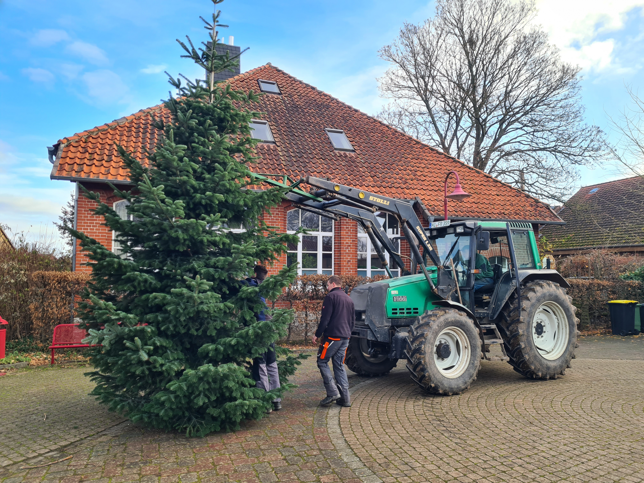 Rechtzeitig vor dem ersten Advent erstrahlte der Heinrich-Rohlfs-Platz vor dem Feuerwehrhaus Schliekum in weihnachtlichem Glanz. Wenige Tage vorher war das allerdings noch nicht absehbar. Denn erst einen Tag vorher war klar, dass ein auswärtiger Spender einen Weihnachtsbaum zur Verfügung stellt. Also machte sich eine Abordnung am Samstagmorgen auf den Weg nach Laatzen, um den Baum zu fällen und nach Schliekum zu transportieren. Dort wurde er aufgestellt und die Lichterketten angebracht.