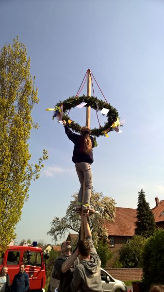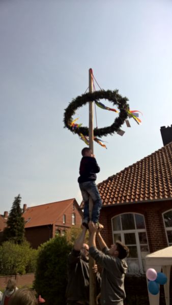 …ist nicht nur eine Zeile in dem bekannten Lied „der Mai ist gekommen“, sondern war auch Motto beim Maibaumaufstellen der Jugendabteilungen der Schliekumer Vereine. Bei hellem Sonnenschein trafen sich viele Schliekumer, um gemeinsam den Mai zu begrüßen. Die Jugendlichen kümmerten sich um das leibliche Wohl und die Unterhaltung der Kinder. Für die Getränkeversorgung haben sie ihre Betreuer auserkoren. Besonders auffällig waren die vielen Jugendlichen der Schliekumer Jugendfeuerwehr. Wo immer eine helfende Hand nötig war, waren die jungen Brandschützer zur Stelle. Bereits bei den Vorbereitungen packten sie tatkräftig mit an, verteilten Tische und Bänke, bauten Pavillons auf und präparierten den Maibaum so, dass alle Kinder einen Gutschein aus der Baumkrone pflücken konnten.