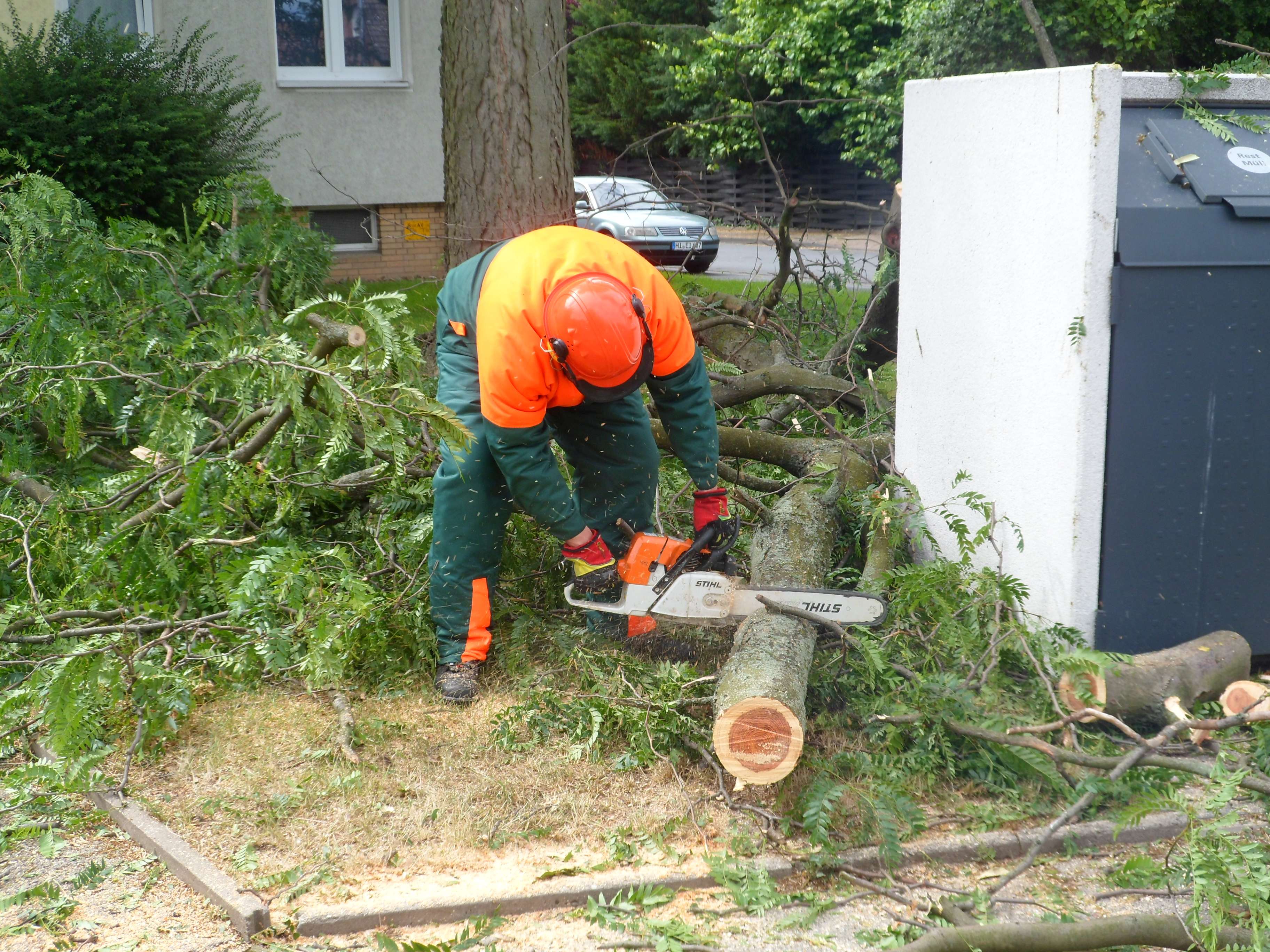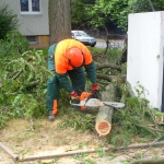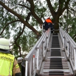 Vor Ort fanden die Brandschützer einen abgebrochen Ast vor der quer über dem Gehweg lag. Mittels Kettensägen und der Drehleiter wurde dieser noch halb in der Luft hängende Baum beseitigt.