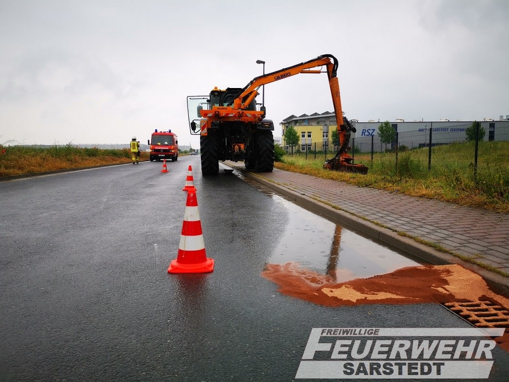 An einem Traktor ist bei Arbeiten am Regenkanal ein Hydraulikschlauch geplatzt. Die Feuerwehr Sarstedt konnte mit Ölbinder und Ölsperren den Schaden eindämmen. Durch eine Fachfirma wurde die Straße gereinigt.