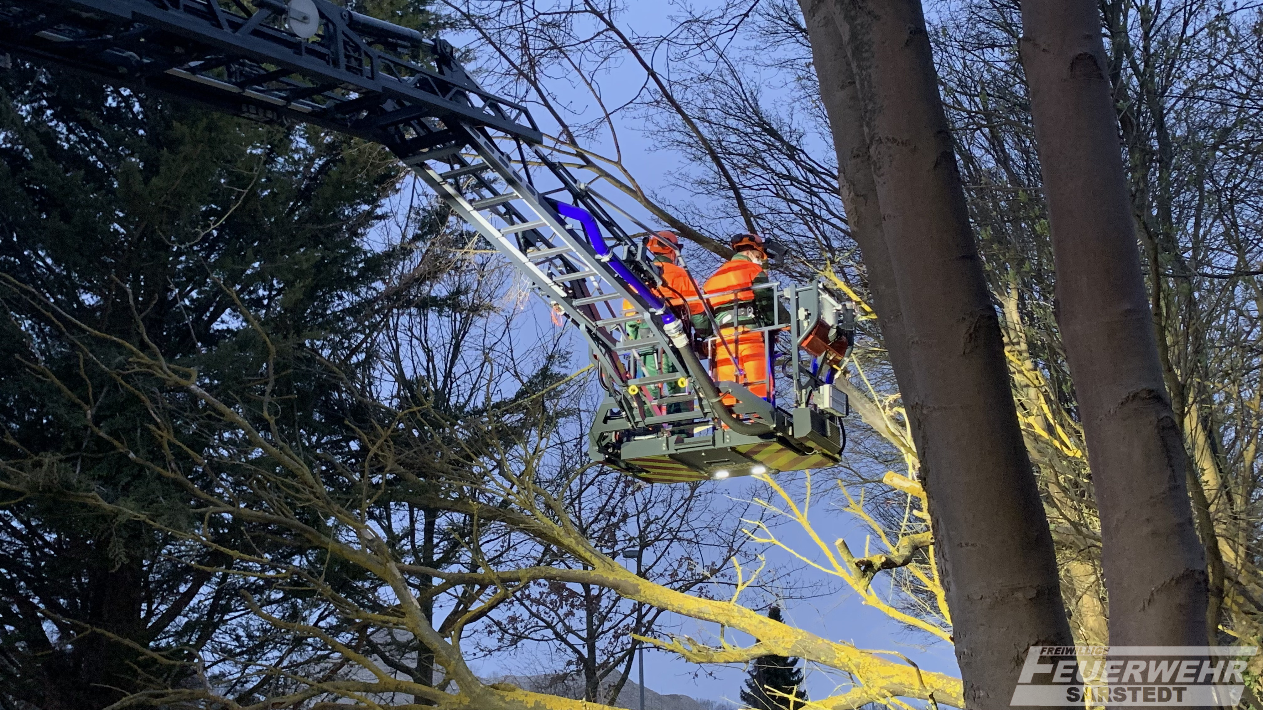 Ein Baum war mittig auf die Helperder Straße gestürzt, wir zersägten den Baum mit der Drehleiter und säuberten danach die Straße.